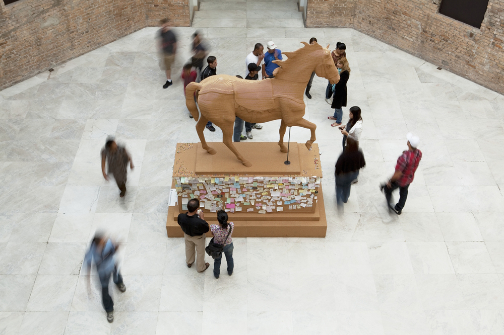 As a cross-section of Brooklyn’s art scenes, the show gives a strangely benign impression. “What’s striking about the works selected is how mild they are,” wrote Ken Johnson in the New York Times. Paul Ramirez Jonas’s The Commons (2011), a cork sculpture of a horse in the style of Greek statuary, is a good example of the general benevolence. The horse wades through a swamp of paper notes pinned to its legs and pedestal by members of the public – feel your democratic spirit sag as you inspect the comments – with tragic solemnity. It’s possible to read this tendency toward geniality as a symptom of gentrification’s sweet and reassuring ethos, though more likely it resolves a tension faced by the curators in telling gentrification’s troubled story, while at the same time celebrating its outcomes. In presenting a survey of its namesake, the Brooklyn Museum can’t help but cheer the borough’s elevated status as an art epicenter (and not merely a satellite), even as its artists grapple with the social implications of so much hype and steep rent.