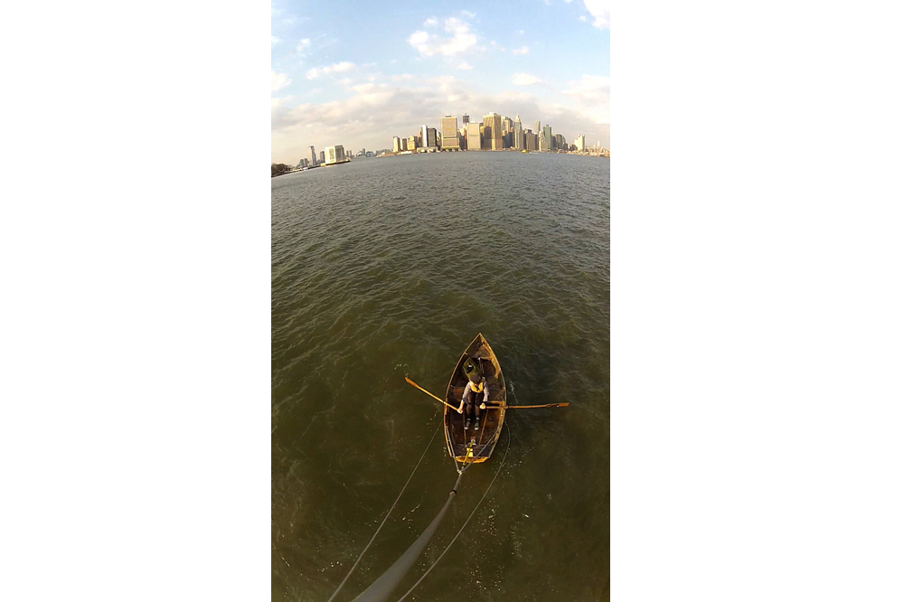 Marie Lorenz explores New York’s waterways in boats that she designs and builds. In her video installation Archipelago (2012), we experience her solitary peregrinations from the perspective of cameras mounted on her head, on a long pole extending from her back, and at the top of a tall mast attached to a rowboat. She moves like the water does, with drifting decisiveness, and without anyone’s assent or congratulation. With the camera set at an odd remove, we witness her intimacy with herself, but we don’t participate in it. We’re more like the wide, dirty city ringing the horizon: there but not there. We share her solitude by awakening to our distance from it.