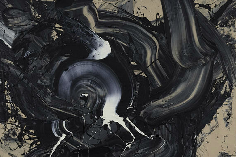Balletic tension rather than brutal rawness persists in the 1980s middle style. Shiraga was continuing to discover himself, often using a single color (black or white) on unprimed canvas, as in Tokkō (Self-Reliance), 1989. In the 1990s, bold colors like black and blue appear atop a bright red ground (see Ususama, 1999).