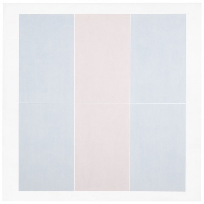 From the time of this lecture until her death in 2004, the titles of her paintings often conveyed a joyful utopia: Fiesta 1985; Happy Holiday 1999; Loving Love 2000. In this phase, her six-by-six-foot canvases generally featured horizontal bands of various proportions, most often in white and/or with different combinations of pale, primary hues: coral, morning sun, sky. Over time, she explored some variations in her compositions and palettes. Her canvases shrank to a more manageable five-by-five feet as she aged. But her main theme remained an unalloyed upliftedness: she once said she had spent ten years painting “praise.”
