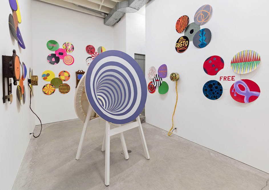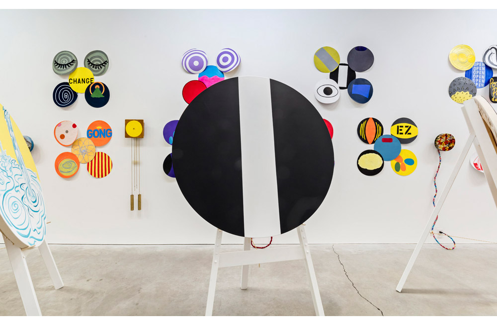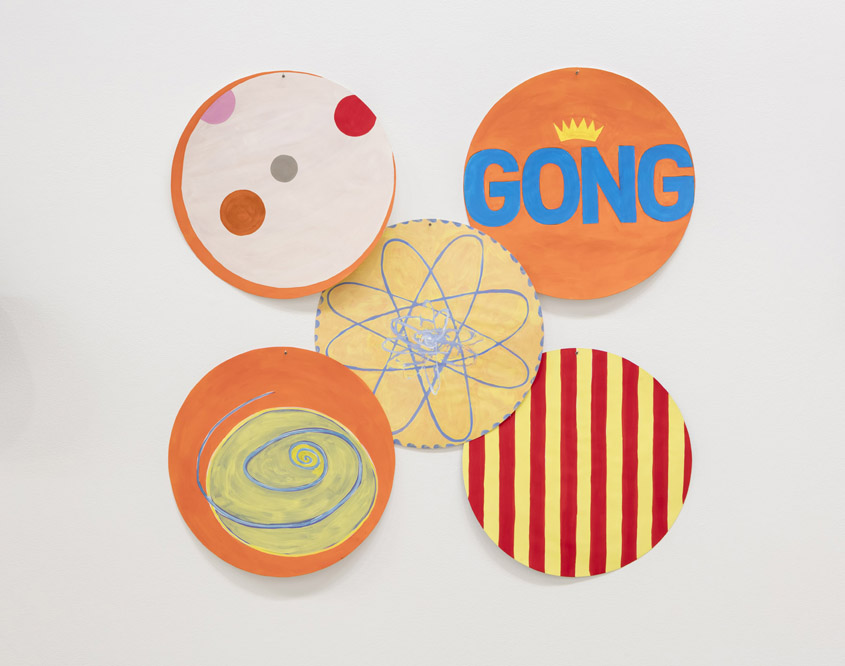 This brings me back to All to All and the space where the profound coexists with artistic play. In this new exhibition, the quantity and material qualities of the work push “play” at another level. As an installation it may first look and sound like its key influences were the “Ex” fairgrounds, the Party City Superstore, and a dash of Marcel Duchamp’s Rotoreliefs. Its dozens of colorful painted-paper disks are hung from small banner-like grommets, and they curl off the wall like posters or prizes. Round cookie tins filled with coins clank as they spin on motors and handless, numberless wall-clocks tick a time unknown. Almost every electrical outlet in the space is used. The center of the narrow ground-floor gallery is filled with easels upon which round paintings of mostly round things sit, like bull’s-eyes, fish-eye lenses, bulbous-headed cartoon characters, psychedelic swirls and suns. Upstairs the party continues, but it’s more like that late part of the party when things get dizzy and memory slurs. Spinning ghost-sculptures mounted on Roomba vacuums are shrouded in cheerful yellow stripes. The wall mimics the fabric design: concentric circles of varying diameters are painted like sound-waves-as-cartoon. The second floor also provides the site of Meigs’s daily chau gong performance, wherein the ring of the gong is sustained for a full fifteen minutes, making sound an intensely physical presence.