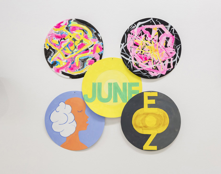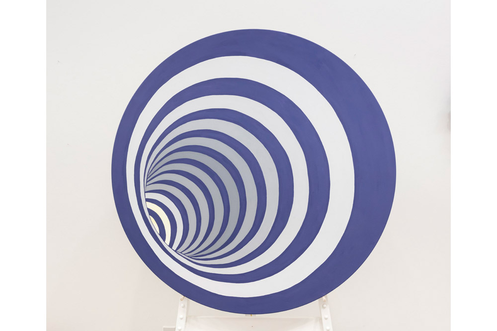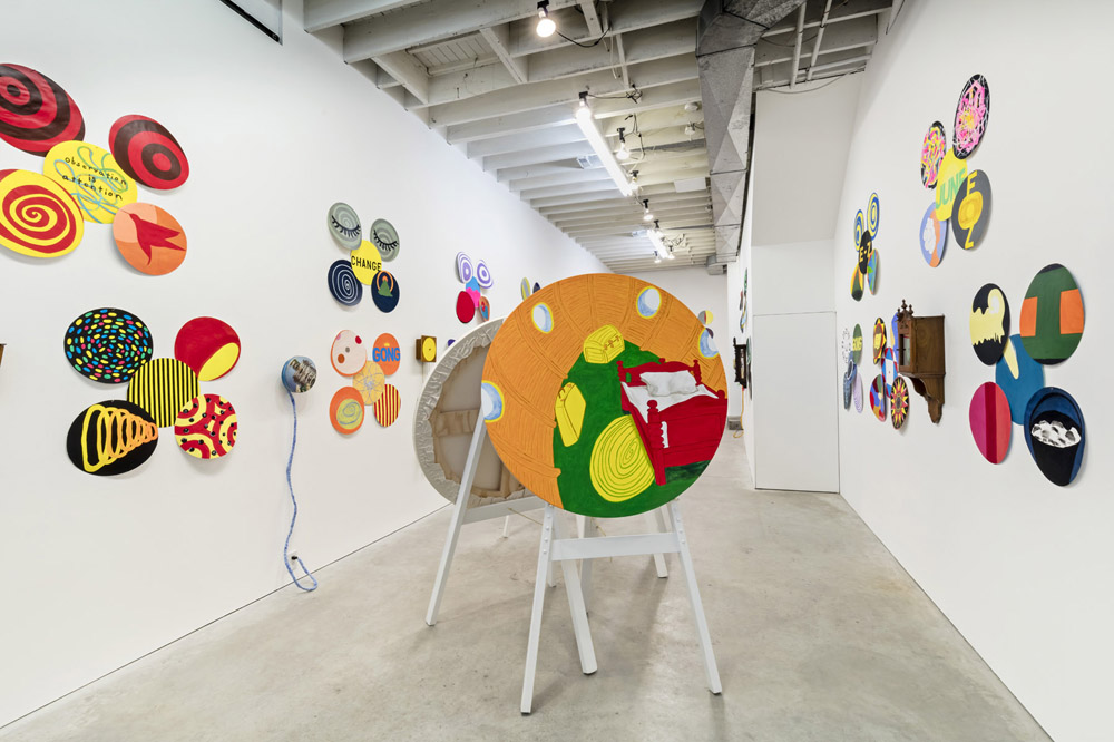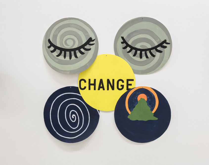 The instrument, often used as a meditation technique, and like yoga widely absorbed into Western culture, suggests goals of mindfulness and self-improvement. It’s one of the many features in All in All that references coping strategies: the party-like exhibition experience suggests a joyful, get-it-out-of-your-system catharsis, while the hypnotic swirls, whirlpools, zips, and folds imply shifts in consciousness in their abstract clarity. Motto-like text is strewn across the ground floor, reading like self-help refrains: “CHANGE;” “EASY;” and “observation is attention.” Others read as notes and diagrams to identify daily basics, like wearing shoes or checking the mail. The sublimation implied by this quantity and character of work is echoed by Meigs herself. In the press release she asserts, “It’s easy. The more you do, the more you do. You keep going. You keep spinning.”