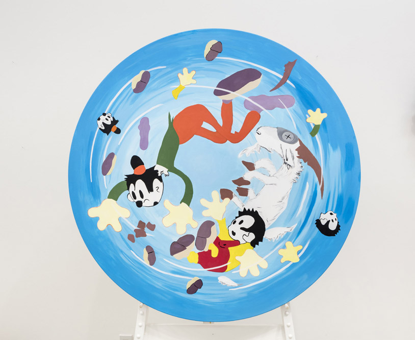 An early critique I received as an artist was in jury feedback for an unsuccessful grant application: “why does this work need to be made?” It was a good question. In hindsight, I think my uncritical answer was because I needed to make it. Applying a version of that question to Sandra Meigs’s current exhibition at Susan Hobbs Gallery, entitled All to All, yields more sophisticated responses. The most obvious is an acknowledgement of the intensity of production. The gallery is full, as in flirting-with-fire-code-infraction full, and Meigs’s prolific rigor transfers to the viewer: I experienced a smiling absorption as I walked through narrow paths between colorful, hand-painted, and comic imagery. The work’s lightness is infectious. Yet despite its clear sense of play and weightlessness, All to All belies a meditative intelligence.