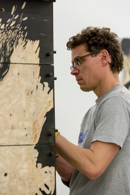 The printmaking process becomes uncomfortably intimate when Caulfield exposes the artist even further with Cloud House, an ongoing experimental sculpture comprised of a set of wood panels arranged into a house-like structure. Like layers of sediment, the work slowly takes shape over time. Watching Caulfield painstakingly carve his mysterious forms into the black-lacquered maple wood, you become enthralled by his obsessive mark-making and acutely aware of its toll on his body. Caulfield admits to me that he worries this performative sculpture might come across like a “how-to” and distract from the content of his work. However, it’s precisely the how-ness of the work that invests viewers in the process behind the work and implicates them beyond mere representation.