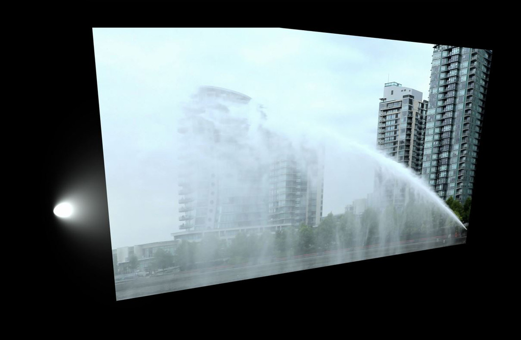 This mise-en-scène approximates the collective psychological complex that grips a city like Vancouver, a place at once uniquely beautiful and irredeemably corrupt. In her 2003 collection Occasional Work and Seven Walks from the Office for Soft Architecture, poet Lisa Robertson remembered watching “the city of Vancouver dissolve in a fluid called money.” Extreme financial pressures by a real-estate market run amok paralyze resistance to such floods. And so we wait and stew. In so doing we resemble the viewers who sit on the padded benches in Beloufa’s installation, observing mayhem unfold at a magma pace.