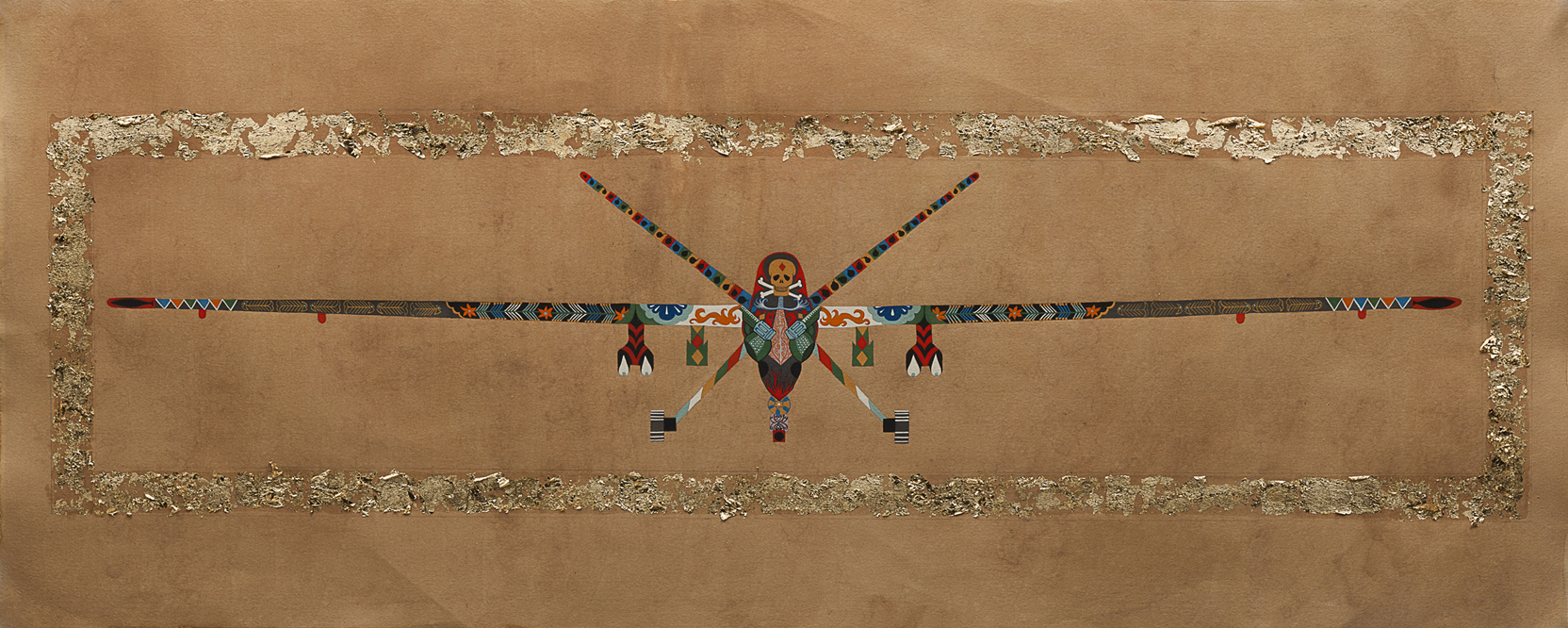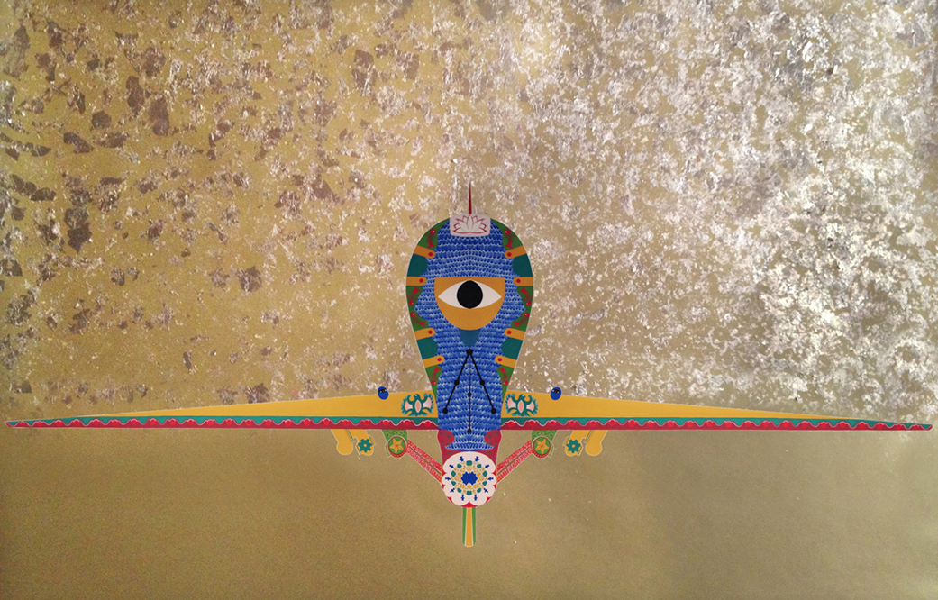 Gouache paintings titled after particular models like MQ 9-2 (2011) combine the hyper-detail of miniaturist painting with the symbolic imagery associated with US drone strikes. Skull-and-crossbones occupy the same visual space as vegetal patterns rendered in blue, orange, red, and green; the non-figurative stipulations of Islamic visual art are a clear influence on Chishty, but not a strict boundary. Natural allegory abounds in paintings like Reaper (2015). Tiny blue birds and wide-open eyes make broad gestures, as flakes of gold-leaf shimmer against visibly warped, tea-stained paper. In works like this, the colorful decorative designs and gold foil situate the vehicles in neither sky nor ground, transmuting aerial logic to one that floats outside spatial bounds. The top-down omniscience of the perspective allows the viewer to see the drone as it sees its anonymized targets: distantly, and within a landscape of decontextualized cultural specificity.