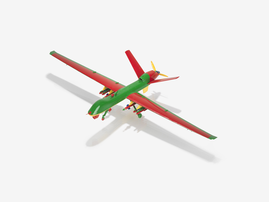 Effectively, Chishty juxtaposes the inherent danger of drones-as-weapons with the non-danger of drones-as-toys. Doing so, however, raises broader, thornier questions about the value of applying generalized, aesthetic responses to highly-specific political questions. Instead of answering this question, Chishty asks a more pragmatic one: should artists focus on cultural specificity or try and appeal to universal ethics? Her answer is simply this: drones are a part of everyday life in Pakistan, and there is no need for to justify this work otherwise. Regarding the inclusion of IMW Contemporary: Mahwish Chishty at Britain’s Imperial War Museum, curator Alex Walton notes that: “Chishty’s exhibition is new in that this is the first time the museum has shown work by a non-British artist who has direct links with the region where this type of war is fought. Drone warfare in Pakistan is part of the context of the wars in Iraq and Afghanistan, and reflects the current state of globalized conflict.”