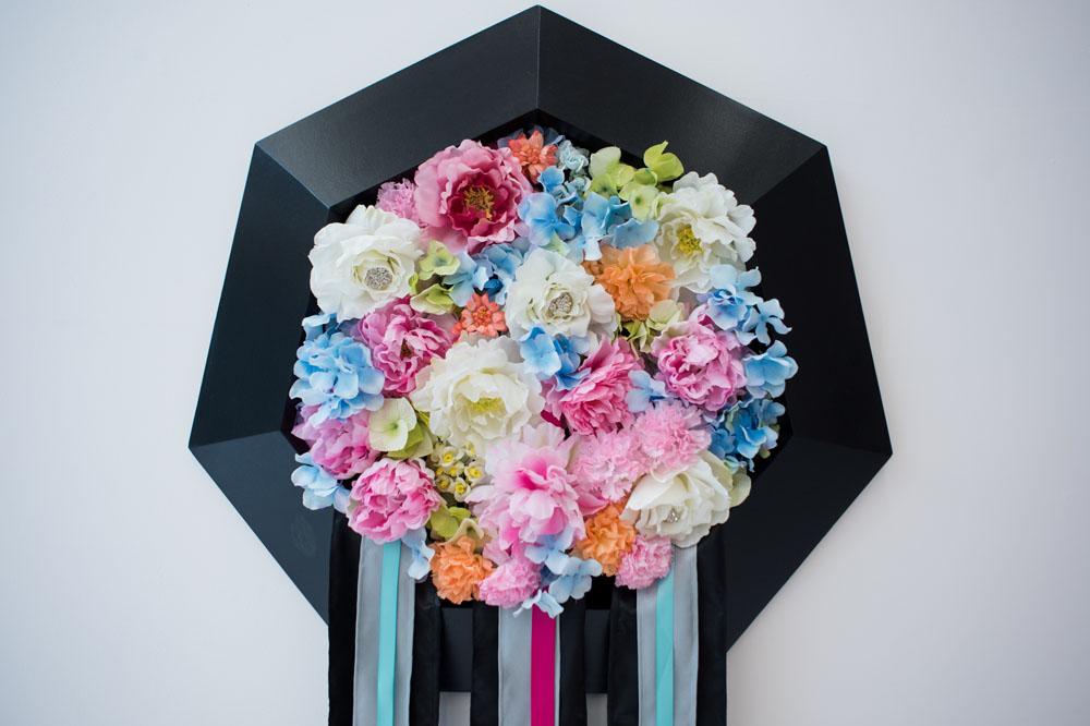 Kleiman repeatedly uses eye-catching, saturated color in combination with cheap materials to frame and amplify gestures of exorbitance and appraisal in places where everything is for sale. She seems especially interested in what lies beneath our feet: cheerful printed carpet from a Vegas casino; the recurrent terrazzo flooring. Such materials cover up cheap construction, as do the gilded glass tiles that adorn one of Kleiman’s two pyramid sculptures. Signals of value in tension with shoddy, chintzy components permeate the show, and Kleiman offers up the most vulgar objects and substances for contemplation: gaudy fake flowers arranged with ribbons and seemingly destined for a trash bin (Prom, 2017); an abundance of lurid gold frames; even an accent nail, that glaring class marker (Sephora, 2017). The adjectives suggested by these objects betray their own chintzy nature, just as describing something as “premium,” “fancy,” or “classy” often conjures the very opposite connotation.