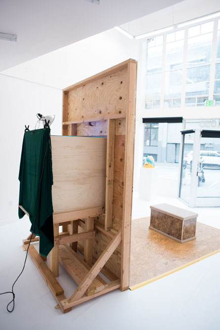 But the work is more than a body of degraded objects. For one thing, Kleiman ruthlessly points out how the backend machinery of desire works, especially in the dominant installation Mall Wall, which sprawls in all directions beyond its store window display, with particleboard flooring and half-built walls covered in artificial laminate. Mall Wall quite literally shows the back of its own machine, with visible clips holding in place curtains and the lights trained on the storefront. Inside the display case, tokens of wealth quickly reveal tangible cheapness: the crystal skull is artificial purple, the marble bust, an impossible bright blue. Many of the other works in the show operate on a smaller scale but employ the same visual rhetoric as Mall Wall, offering themselves up as both coveted objects and staging-sites for critique. Kleiman diffuses humor throughout this scene, as in If the Tooth Fits (2016), which proffers a giant sculpture of teeth sitting on a bar stool, seemingly ready to chomp into some instant gratification. The art itself is hungry for something to consume.
