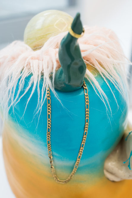 The visual language of the exhibition reads clean and fresh at first, its sculptures and installations packaged in the familiar Tumblr pink and gold accents of post-internet merchandise. Displayed in glass vitrines, elaborate gold frames, and – in one case – a replica of a department store window display (Mall Wall, 2016), Kleiman’s pieces lure with their bright colors and tasty suggestions of base desires: sculptures that look like dildos, wall pieces made of candy-like terrazzo flooring material, a crystal skull that, in recalling Hirst’s famous line regarding his diamond skull – that his medium is money itself – signifies simply price itself. Right away, the show colludes us with our own attractions to things. One wants not just to look at and touch Kleiman’s work, but to eat it, to screw it, to cash-in.