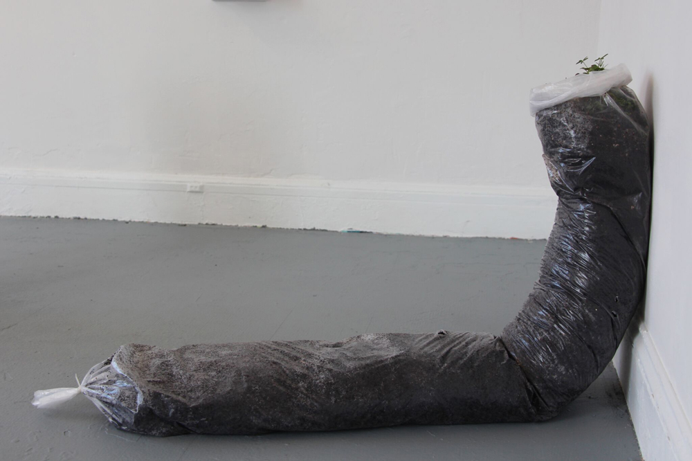 As with the plover, mistaken identity can change daily routine, and shape long-term policy. Escott shows herself complicit in the flawed, if earnest, logics underwriting these errors. In another piece, Domestic Interiors 3 x 5 (2017), she responds to studio visitors misnaming a local endangered butterfly Escott has been painting (the Xerxes Blue Butterfly), by acting as though these interlocutors are correct in their interpellation. In fact, she begins to grow the only plant, a type of lupine, that can serve as a habitat for the species that she wasn’t painting (the Mission Blue Butterfly). This lupine appears in the exhibition – also, of course, housed in plastic packaging. Slumped up against the wall in a comically long tube of soil with only a few leaves poking out of the top, the figure simultaneously evokes the inefficiencies of well-meaning conservation efforts; the ways that human tropes of ecology are limited by shallow, often mistaken perspectives; and how, seemingly, we must anthropomorphize nature in order to mobilize our care.