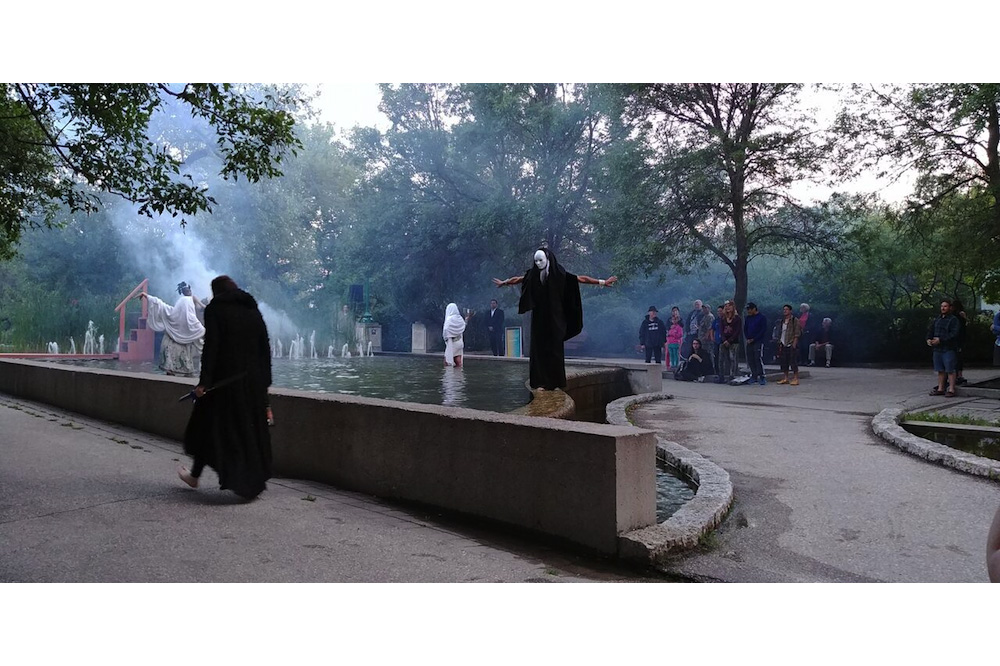 All cities conduct meaning, provided an artist can pick up their fugitive signals. On several subsequent evenings, Akhavan did just this. With his Variations on a Monument (2017) – which, as with every piece in Stages (featuring nine artists across ten venues), was a work made for this occasion – queens ascended a decommissioned monument plinth, within a concrete pond in a disused park. Licked and swathed by dry ice, the performers pantomimed whipping ballads. Akhavan’s coupling of gesture and history was deft, both touching and elusive. His chosen site had once been a a furtive pick-up zone, for Winnipeg’s gay community, and his performance-over-pond format was cribbed from Iranian custom. Here, the throttling conservatism of North American public space shattered into twilight.