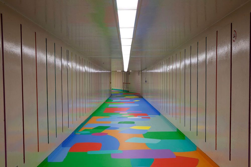 For this reason, I developed a taste for more humble work: the pieces illuminating banal quarters of the city, or throwing strange echoes into curious, but un-imperiled locations. Federico Herrero’s Landscape (2017) was a mural that exceeded the limitation of murals, coating the walls, ceiling, and floor of a long pedestrian underpass in painted color: stretches of yellow broken by lily-pad patches of blue, green, and orange, and oblong collages made from every hue. It’s as simple as it sounds. But the gray cityscape above gave the work a warming consequence: when the buckling prairie winter comes down, this effect will be multiple.