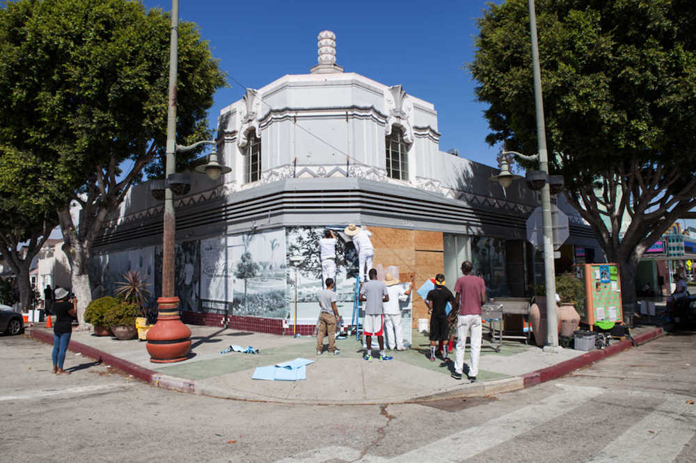A+P’s gallery was originally on Leimert Boulevard, in Bradford’s former studio, right next to the building that housed The Right Way Foundation’s program, which helps young, former foster youth transition into employment. Later, the gallery moved to larger accommodations in a former beauty supply store around the corner on Degnan, reserving the Leimert Boulevard buildings for social services. A+P’s office was on Degnan too, and they were slowly renovating an Art Deco building on the corner of Degnan and 43rd Place. They’d acquired, just to the naked eye, a lot of real estate.