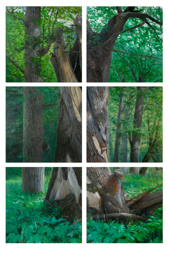 As Macfarlane points out, the “eerie is alarming because its cause can rarely be explained or even detected.” Similarly, Year With a Tree does not present itself as eerie immediately. Rather, it becomes eerie as the viewer walks through the timeline – ending with the aged, dry, grey images of the tree in winter. Although there are small mossy signs of spring’s regeneration in the last three paintings, we are left at an uneasy point in the sequence. The winter of 2017 must have been longer than the previous one. When Pettibone initially began the project exactly a year earlier, the landscape was fresh-looking, moist, and green. It’s possible, though only gently implied, that the shift bears witness to the effects of anthropogenic changes to the environment – including shortened, extended, and unpredictable seasons. Even eerier is knowing that one year of affecting images would never be enough to alter the minds of foolish skeptics who make sport of denying decades worth of mathematical data. Or, perhaps the eerie is not really in the canvases at all, but buried deep in an especially twenty-first century anxiety; how, after all, can anyone but a fool look at a landscape painting today and not be seized by a deep ecological disquiet?