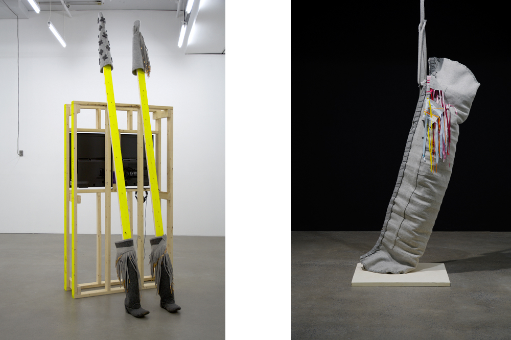 Only Miller’s painting performs a feat of immediacy, grabbing you instantly. Hupfield’s own works require a major energetic downshift to appreciate. The paired video performances take a long time to unfurl, and it’s hard to join the same frequency as her muted felt sculptures. But linger a while, and Hupfield’s wit comes creeping into the quiet. Apart from being thick and benumbed, her sculptures also look ultra-contemporary, like they might fare better in a trendy furniture store. For Hupfield, I suspect the greyness is partly a joke on information-age aesthetics and how globalization makes everywhere nowhere. Coming out of Galerie de l’UQAM after visiting the show, I passed a woman wearing simple grey garments that flowed down from her head and shoulders, and then a man clad in a grey sweatsuit. They could have been emissaries from Hupfield’s grey dimension: unresolvable moderns: inscrutable yet basic, matching everything.