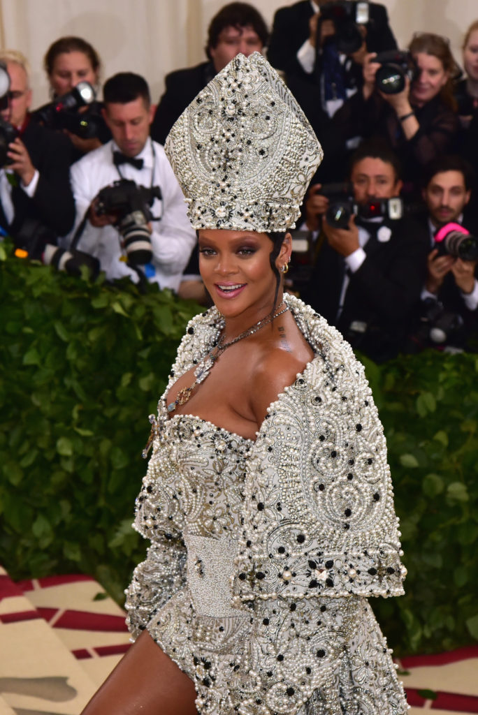 Three days before the opening of the Met Costume Institute’s Heavenly Bodies: Fashion and the Catholic Imagination, the Museum held its annual gala. Those who couldn’t afford the $30,000 ticket fee could watch behind a velvet rope as guests adorned in religiously inspired couture wafted over a red carpet leading into the museum. Rihanna led the way with a pearl encrusted, thigh and cleavage-exposing take-off on the Papal robes. Katy Perry, in a gold mini-dress and knee high gold boots, stopped to kneel on the steps, careful not to damage her giant white angel wings. There were other riffs on the Virgin Mary, Joan of Arc, Holy Warriors, and even Jesus Himself. In the press the next day, breathless praise from the style mongers mingled with charges of sacrilege from conservative commentators.