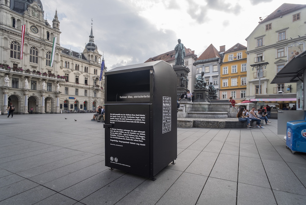 Steirischer Herbst translates to “Styrian Autumn”: Styria, or Steiermark, is the name of the province of which Graz is the capital. The interdisciplinary arts festival is entering its 51st year, its first under artistic director Ekatarina Degot. The provocateur on the bus is responding to a notice placed in the local newspaper, by artist Yoshinori Niwa: “Do you worry about your Nazi-uncle’s old hat still stored in the attic? What to do about it?, you ask yourself. I have THE solution for you!” In Graz’s busy Hauptplatz, Niwa installed a large deposit bin, bearing the prompt from the newspaper. This is where the painting is headed. Every day the box is emptied and its contents destroyed. “Questionable past?” reads the sign, “simply get rid of it!”