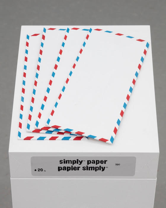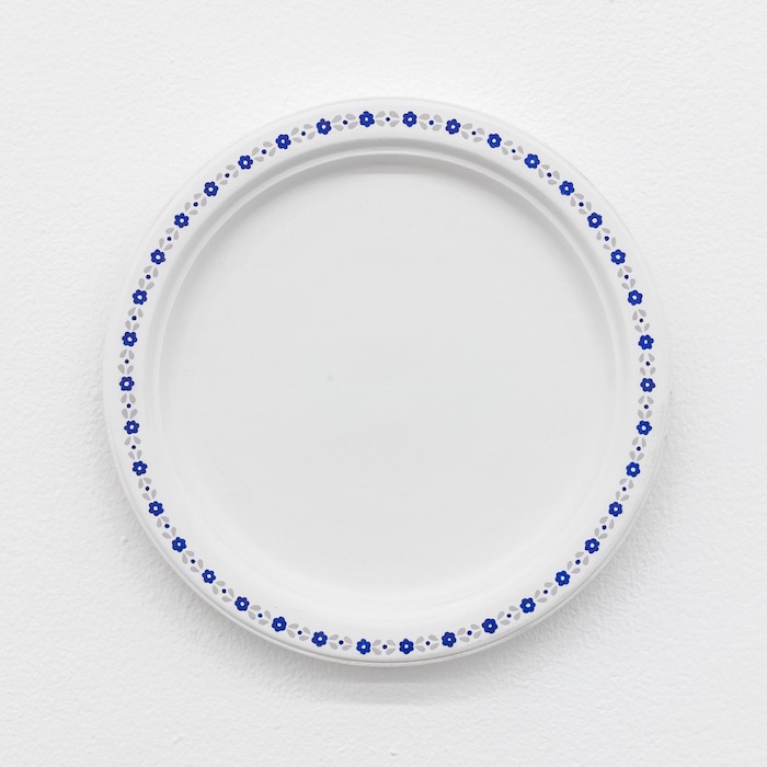 The first bit: despite its titular promise, the show contains hardly any “works on paper.” The majority of the pieces, whether hung on the walls or placed around the gallery floor, are three-dimensional mimetic reproductions of objects: not things themselves, but eerily perfect replicas. The installation teems with facsimiles of paper, as well as a related assortment of simulated office supplies. Uncannily crafted erasers, markers, and pencils sit atop imitation reams of white bond paper, still in their folded packages. On the walls, clipboards of varying sizes (Clipboard Constellation, 2019) share the space with other quotidian items: colorful, woven shopping bags, the kind one finds in any Chinatown; a single sheet of absorbent paper towel, framed; a disposable paper plate; an egg carton, also framed.