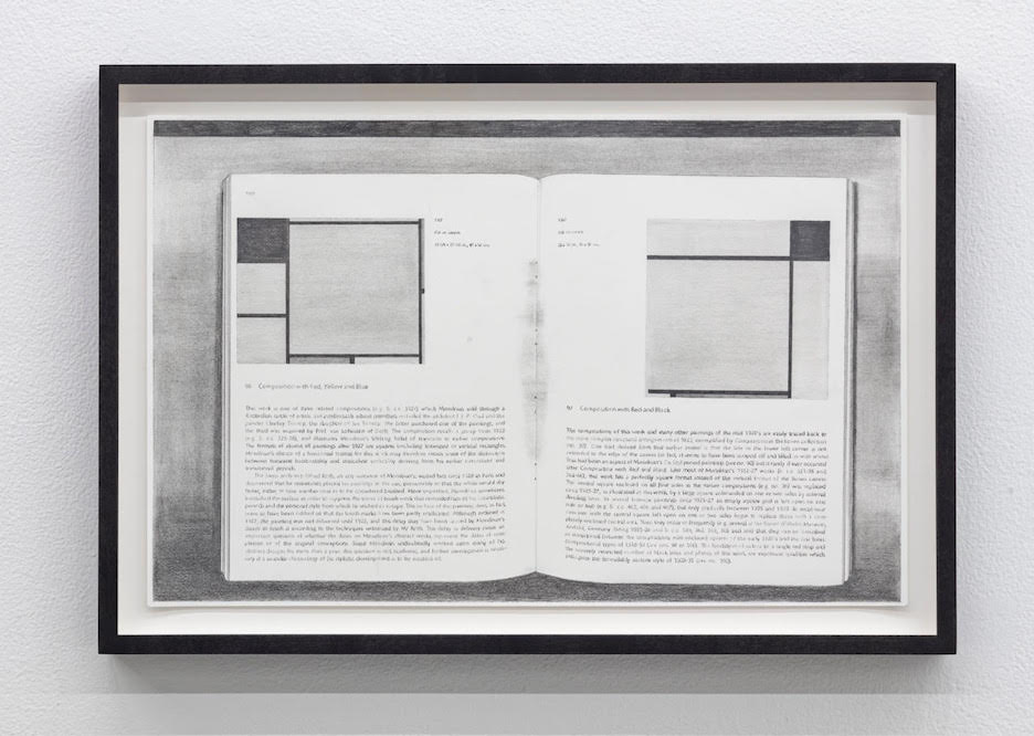 The only actual works on paper are three graphite drawings featuring black-and-white illustrations of Piet Mondrian paintings in books (Composition with Red, Yellow, Blue and Black, 2019; Lozenge with Grey Lines, 2019; and Composition with Red Yellow and Blue / Composition with Red and Black, 2019, respectively), which sit inconspicuously near the entrance and act as a decoder for the exhibition. Here, Mondrian’s grids are presented sans color in a transposition that emphasizes their supportive role, as the armatures for chromatic events. They’re presented as greyscale interlocking marks, highlighting Mondrian’s obsession with New York City thoroughfares, and the gridline of the American city. The inclusion of these drawings transports the three-dimensional forms to a different plane, and suggests that the latter be read as geometrical studies rather than mere conceptual tricks. For Partheniou, as with the ancient Greeks, materiality, far from base or banal, is an expression of the sublime, the ultimate manifestation of a broader order that encompasses and ennobles us. “Let no one ignorant of geometry enter here,” her forms seem to echo the legendary carving embossing the doorway to Plato’s Academy.
