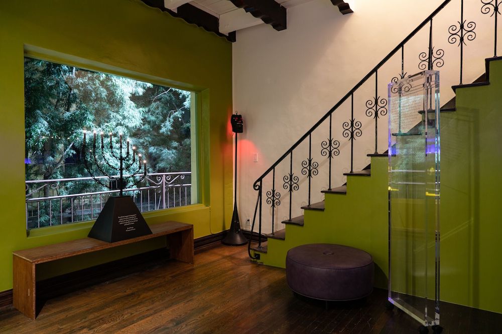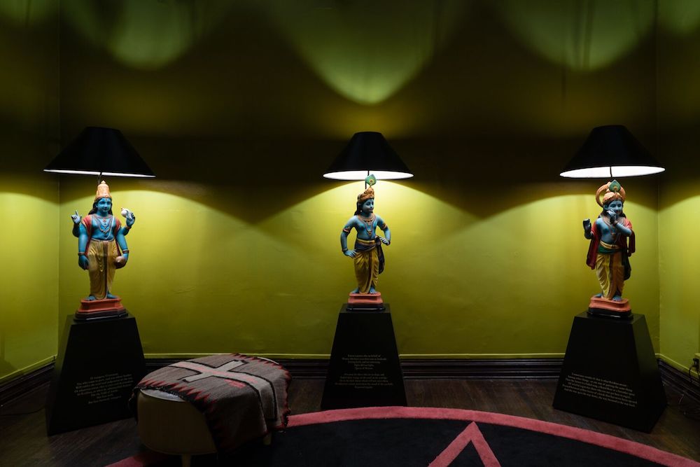 Mindless submission to a higher power was something Boskovich challenged in his work while simultaneously reveling in imagery of the divine. Hindu, Buddhist, and Catholic motifs reappear throughout the show. These clash with fetish objects and paraphernalia: regal purples and demonic reds blur with army camouflage and black leather. Bondage Menorah (1997) a menorah made of chain and US military-issue camouflage flashlights greets visitors upon entry. His living room, which he called Boskostudio, has been recreated here. Furniture adorned with symbols, mantras, and quotes from Genet, Ginsberg, and Eliot collects in the space like little monuments. The space invokes both a psychosexual dreamscape and a state of religious ecstasy. It’s hard not to feel the man’s presence, to speculate what he thought about in that room, who he prayed to, who he fucked. The space seems to suggest that Boskovich liked playing God himself; a large convex mirror serves as the centerpiece in Boskostudio, suggestive of some central omnipotence. He had surveillance cameras and monitors all over his house and a complex alarm system. By emulating idolatry and the language of spirituality, Boskovich presents us with a distortion of conventional values and imbues his own life with a kind of ecclesiastical drama.