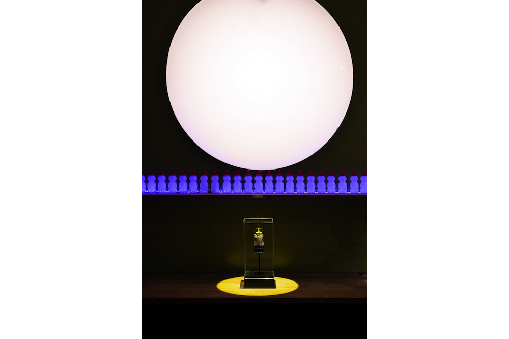 Many of the works in Psycho Salon are forms of self-portraiture: encased in glass, placed on pedestals, or behind ornate frames with inscriptions. A work from 1997 called Right Rectangular Chamber Having the Volume of the Artist’s Body is as-advertised, bearing an inscription from Jean Genet’s Prisoner of Love. This work, like so many others in this show, suggests the artist’s anticipation of his own posthumous success. In building these little monuments to himself and his demons, Boskovich participates in the construction of his own mythology. He recognizes himself as a figure to be remembered and, maybe optimistically, to be worshipped.