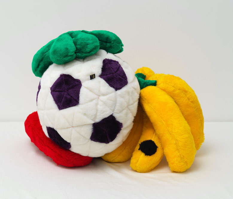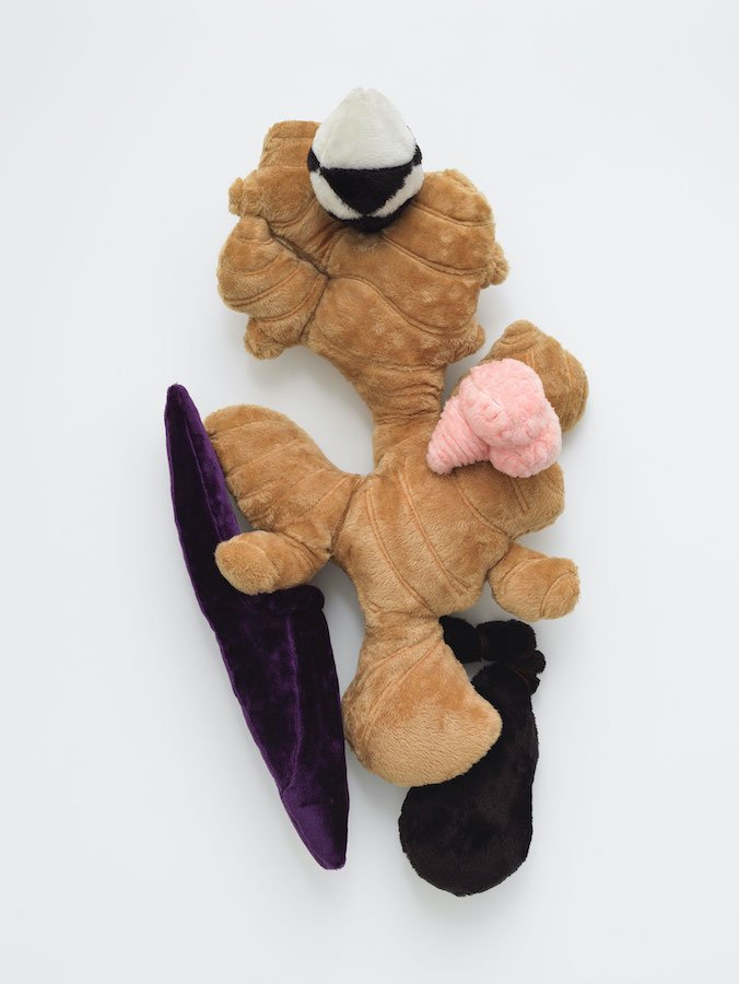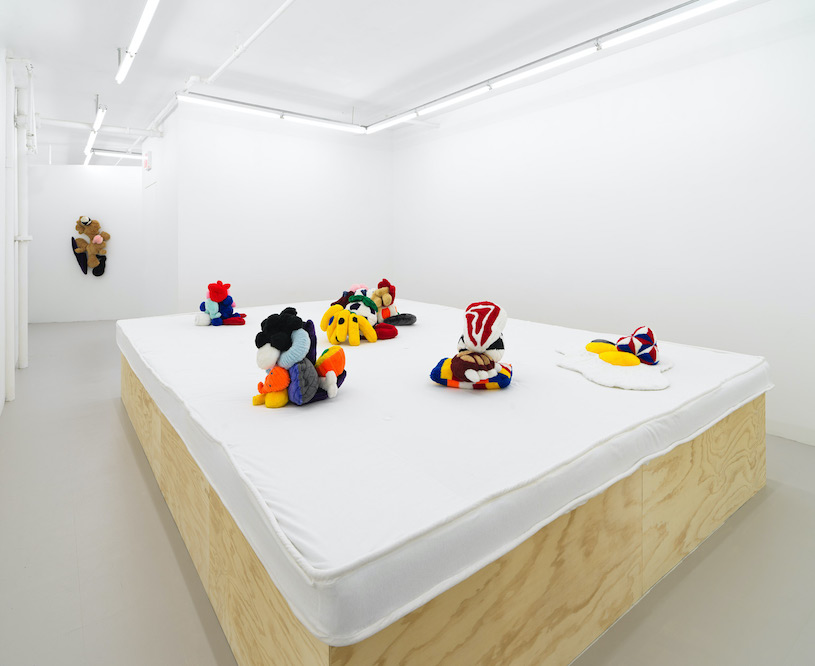 Alan Belcher’s Friends at Downs & Ross is an afterparty. The works in the exhibition are a series of mascot-like plush sculptures sitting in groups on broad, mattress-topped plinths, hanging out as if coming down from a night at the club. Each cuddly character is composed of mutant combinations from a lexicon of emoji-like elements that include body parts, geometric shapes, foodstuffs, household items, “traditional Asian medicinal aphrodisiacs,” and video game icons. Though they have the bright colors and professional facture of kids’ toys or corporate swag, these “friends” were hand-sewn by the artist. They vary slightly in size but most of them would be pretty impressive prizes at a fairground shooting range. Most importantly, each one is named for one of Belcher’s own friends or acquaintances, making the ensemble a portrait – a screen capture, you might say – of Belcher’s social scene, in which his dual position as an artist and gallerist made him a nexus point.