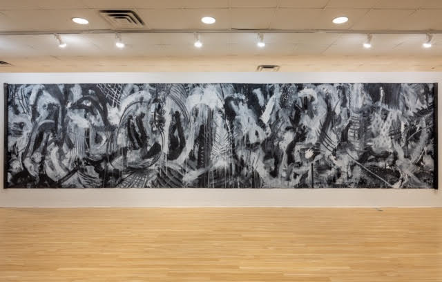 In response to this particularly idyllic site, Chen challenged himself to create a large cycle of paintings in an unusually exuberant monochrome – a radical departure from the opulent, expressive colors that had characterized his practice to date. The resulting works – sweeping abstractions occasionally punctuated with punky icons and figures – were an attempt to reconcile controlled calligraphic energy with the destructive charge of graffiti, according to the artist. To set the tone for the installation, Chen had imagined the moment after Houyi (a heroic warrior from renowned  Chinese myth) had shot down eight out of the nine suns that wreaked havoc on earth; the dead among them resumed their original form as three-legged crows, and life began to rebuild on scorched land. This moment is at once eschatological and hopeful, which makes it eerily relevant to the magnitude of change that defined the tumultuous chapters of Chinese history since the late 19th century. Many of these chapters are evoked in the very site of the Yeh Art Gallery: the colonial invasions beginning in the 19th century; the 1911 Revolution led by Sun Yat-sen, et al; the Sino-Japan Wars; and the alliance and struggles between the Chinese Communist Party and the Nationalist Party (KMT) that foreshadowed the current geopolitics of Taiwan. At the same time, the utter totality of mythological disasters increasingly parallels that of the current COVID-19 pandemic, which halted the exhibition itself, halfway into its three-month run.