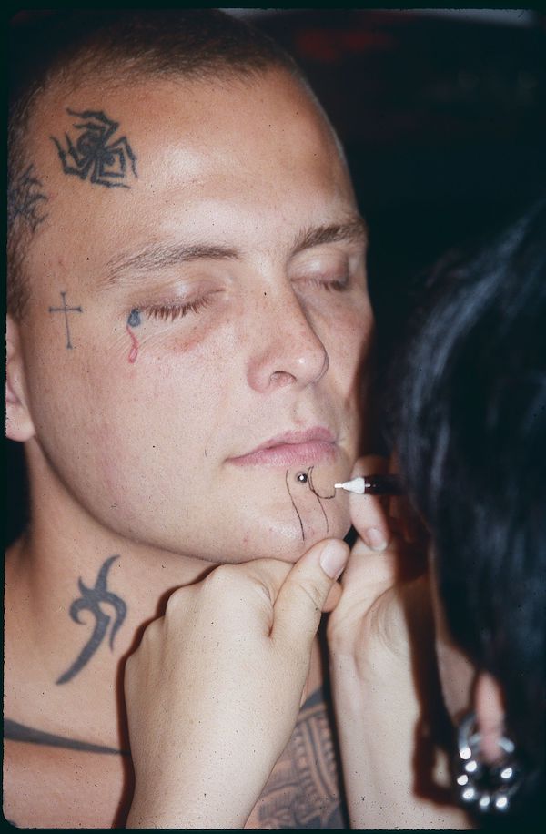 Ironically, much of this frightening white macho culture is drawn from racial subcultures and stereotypes. The tattoos on Athey’s face are inspired by “cholo custom,” and the swastika on his neck from Indonesian culture. The skinhead’s brusque, hard-edged masculinity is a mimicry of stereotypes of Black male masculinity, as Athey cites from sociologist Murray Healey’s 1997 book Gay Skins: Class, Masculinity, and Queer Appropriations. “Nothing is pure,” Athey has said in interviews, and whiteness certainly isn’t either. The essay ends as he decides to cover the swastika, and the fifteen-year stint with the tattoo is framed as a juvenile phase.