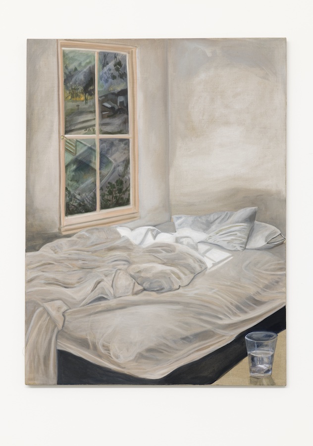 For Mulleady, the catastrophe of the picture is rarely painted directly, it often resides at the margins, at the very edge: through a window, on the horizon, off in the distance. Consider the painting Insomnia, exhibited at Galerie Neu in Berlin for the 2018 show Mouth-to-Mouth. At first glance, the painted scene seems unremarkable: the work is comprised of a single bedroom, an unmade bed, and a glass of water. The painting’s title clocks the time and occasion of the picture as a distressed and prolonged moment. Anxious, dull, leaden, the texture of the crumpled sheet suggests as much, though there is no figure present to ask, “Why is the picture sleepless?”