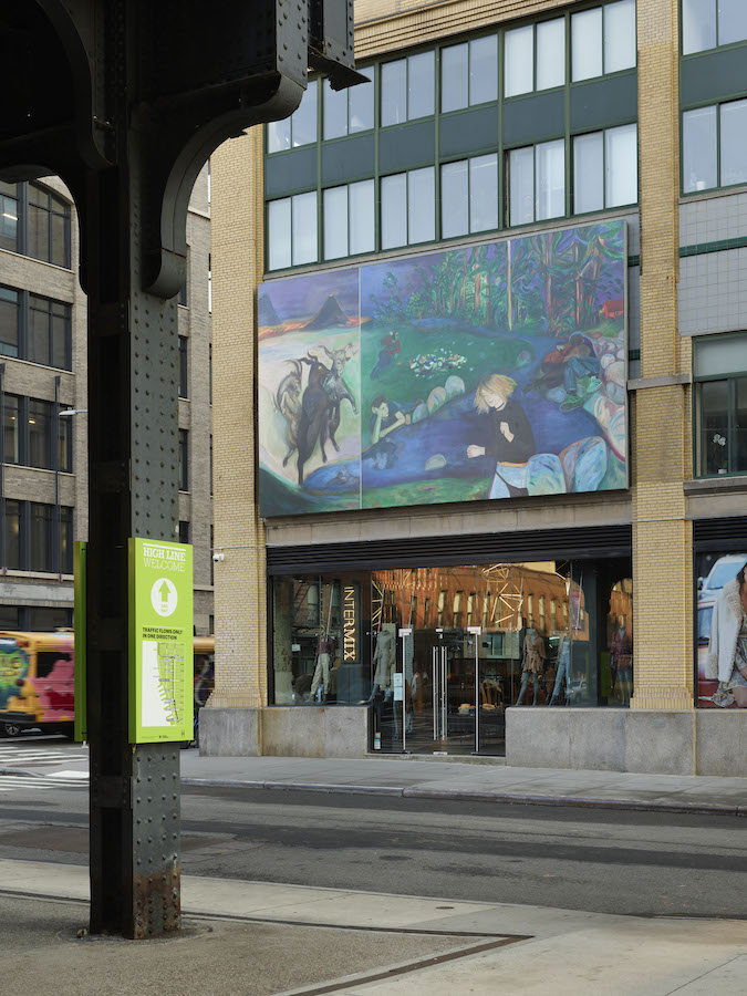 Last year, during New York City’s extended lockdown, one of the few works still on public display was a mural hung outside the Whitney Museum of American Art by the painter Jill Mulleady. Though the museum was shut, a large-scale reproduction of Mulleady’s painting We Wither Time in a Coil of Fright (2019) remained visible to pedestrians on the ground below. When encountered in a near empty street, the picture made for strange viewing. Mulleady’s mural is one of reverie and dream. Set at the verge of a wood at twilight, a diverse cast of characters array themselves amidst a volcano and winding stream. Twilight marks the time of the picture as a point of indistinction, a threshold state where corporeal and psychic states loosen. At the far left, a group of goats stand upright and stare Narcissus-like into the stream below. In the immediate foreground, a woman dances as if caught in trance. Behind her, in the middle ground, a man stares longingly across the stream as a figure behind him tosses trash onto a pile. On the far right of the picture, set on a rocky outcropping, a couple are entangled in an embrace, while further back, at the edge of the forest, a witch has stumbled out of the darkness. As if transfixed by twilight’s hazy, transitional energy, each of Mulleady’s figures seem unaware of one another. The effect is both otherworldly and strange.