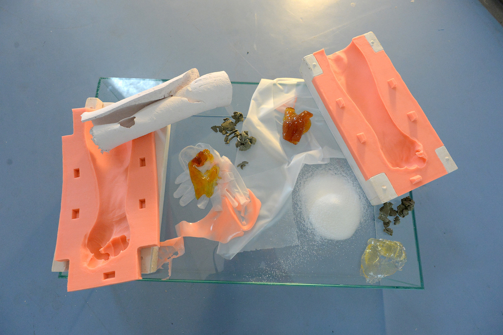 RG: Yes, we have created sugar hands that show the fist. This gesture sort of has multiple aspects. One of them is that we’re sort of fortifying the institution with our other-wise bodies and corporeality, and we’re talking about a caring institution [in the same way of] the queer concept of fisting and penetration of the human body, which requires a great deal of care and caution and trust towards one’s partner. So it is also a hand that seems to want to trust the institution of which it is fisting and penetrating the internal structures, which are so patriarchal, racist, sexist, and fully dominated by cis hetero males. Then it is also the hand that demonstrates and resists these patriarchal structures. And at the same time, that hand is falling and breaking into these puddles, and it’s drowning.