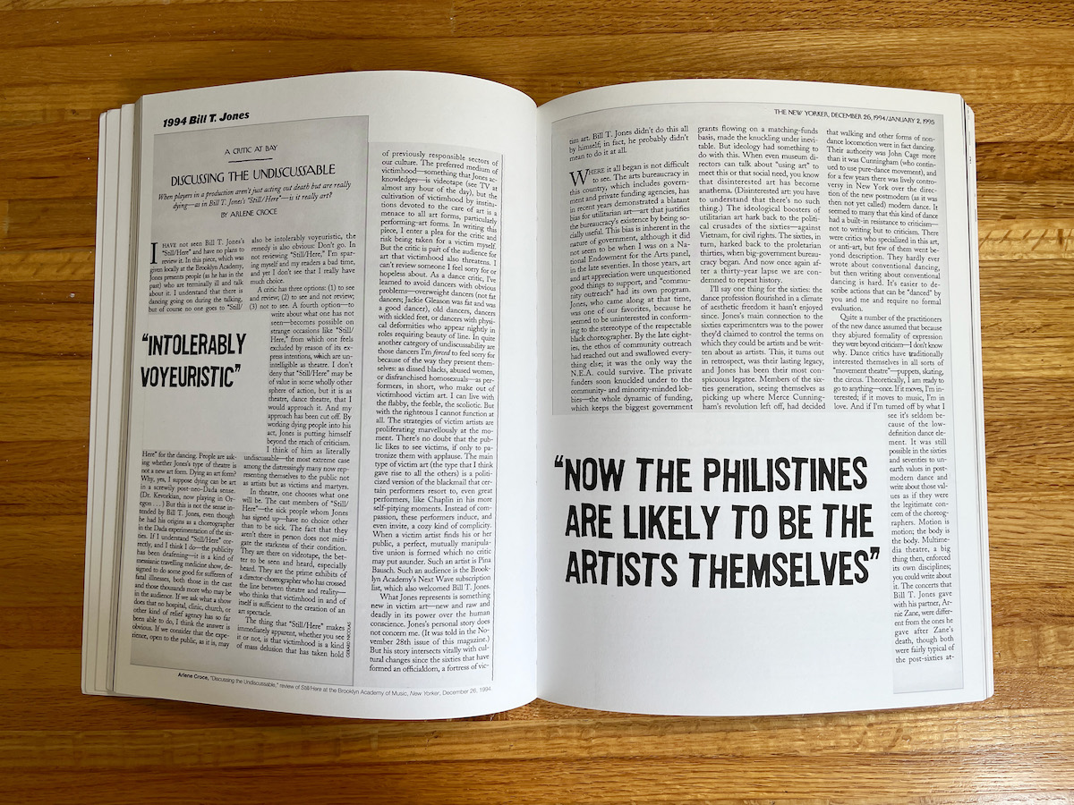 The perverse emotional center of Bad Reviews is Arlene Croce’s New Yorker essay “Discussing the Undiscussable,” about her refusal to attend Bill T. Jones’s 1994 multidisciplinary dance performance Still/Here, which incorporated videos of people talking about their experiences of terminal illness. I wasn’t aware of the review before reading the book but knew immediately that it was infamous. In 2023, it would be called clickbait, and I was surprised by my belated realization that this type of writing predated the social internet. It is in every way offensive. Croce’s argument is that art with performers who are dying isn’t worth seeing because it cannot be transcendent, and that such work is weaponized against criticism like a human shield, which kills the critic and threatens the audience (“The critic is part of the audience for art that victimhood also threatens”). As an act of malpractice, it’s a powerful one, because in her bias and confusion she doesn’t realize that in dying, we are all at some point the performer and the audience. In reading Croce’s essay, I came to feel that transcendence is another type of mystification that places art outside the realm of human biological and social activity.