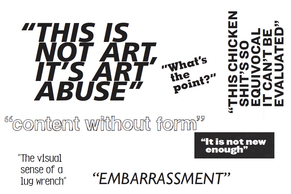 Any photos that originally accompanied these newspaper and magazine clippings, and later screenshots, were excised. There is no contextual information aside from basic bibliographic details, the book’s chronology, and editorial statements by Mir and Griffin. The significance of each review to the artist is also obscured, because although the participants selected their reviews, Mir states that she “didn’t ask, and most didn’t explain” why they sent what they did, or in what sense they felt each review was bad. One hint appears in the acknowledgments, where Robert Longo, in a recollection to the editors, says of Roberta Smith: “Her review single-handedly derailed my life . . . I perversely respect her for it.” These editorial decisions have the effect of disembodying the criticism from the art. I can see why all of it would have felt significant to the artists, but it was difficult for me to extract from the collection more than a sense of the critics’ repeating forms: generational shifts not understood; art-making modes too unfamiliar or messy; results too disposable to be considered fine art.