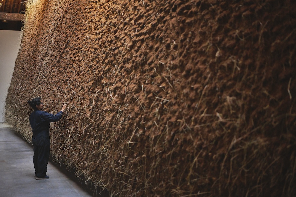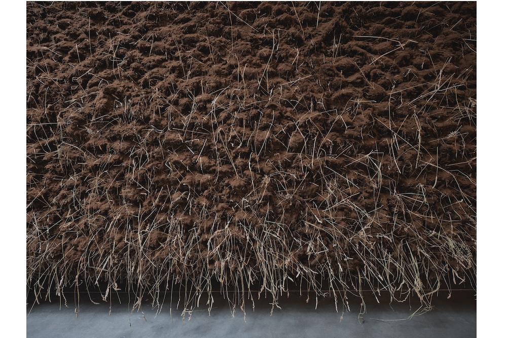 Over the course of her thirty-year career, Morelos has been deeply informed by the mythologies and practices of Indigenous groups from the Colombian Andes and Amazon (such as the Uitoto, indigenous to southern Colombia). Her earth-hewn sculptural installations reflect the distinct Uitotoan cosmovision that, as Morelos writes in the forthcoming catalogue, “the universe ‘is a basket in which everything that exists is woven.’” El abrazo enacts this philosophy of interwovenness by explicitly tethering the body to, and infusing it with, the earth. A massive, heaping mound of soil peppered with intermittent stalks of grass, the earthwork’s loose pyramidal shape recalls ancient ziggurats, burial mounds, and earthen adobes, pointing to the myriad ways in which mud has functioned as a material for cradling, entombing, and housing the human form, both dead and alive. At the same time, the work’s economy of materials and concise visual composition directly nods to languages of sculptural abstraction, a consistent quality of Morelos’s work and a reminder that, even as she undermines the colonial logic of the Western canon, its aesthetic tropes nonetheless inform her practice.