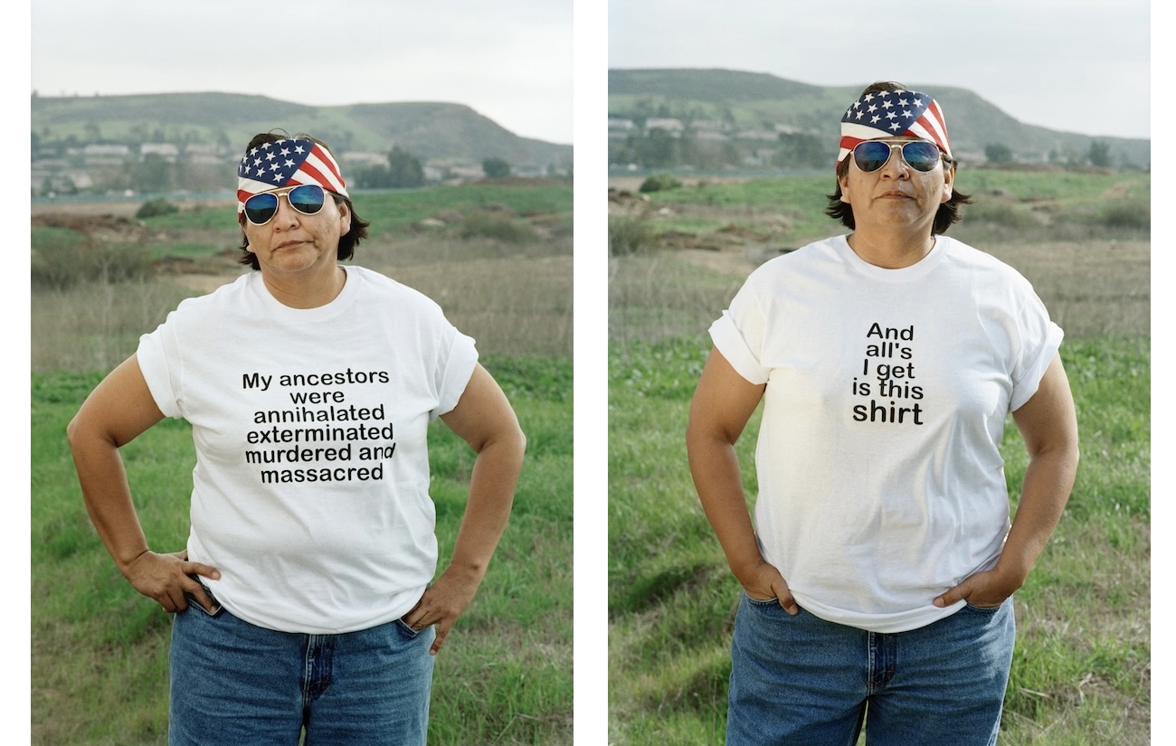 Hung horizontally, with seven portraits bookended by two photographs of land—a constant backdrop and presence in Niro’s art—The Shirt first presents an Indigenous woman wearing a T-shirt with the words “The Shirt” emblazoned across her chest. Subsequent portraits show the same individual wearing similar T-shirts with different messages such as “My ancestors were annihalated [sic] exterminated murdered and massacred” and “Attempts were made to assimilate colonize enslave and displace them.” Closer to the end of the series, there is a panel in which the woman is not wearing a T-shirt at all, and ultimately the portraits conclude with a white woman in a T-shirt that reads “And all’s I get is this shirt.” The shift in the messages and images, from somber to insouciant, is striking.Niro is an artist whose work has always been ahead of her time, and her photographs, like this series, have the jauntiness of memes. On the surface, internet memes are a source of light entertainment, but the most effective among them are succinct, snappy tools for self-expression, connection, and political subversion.