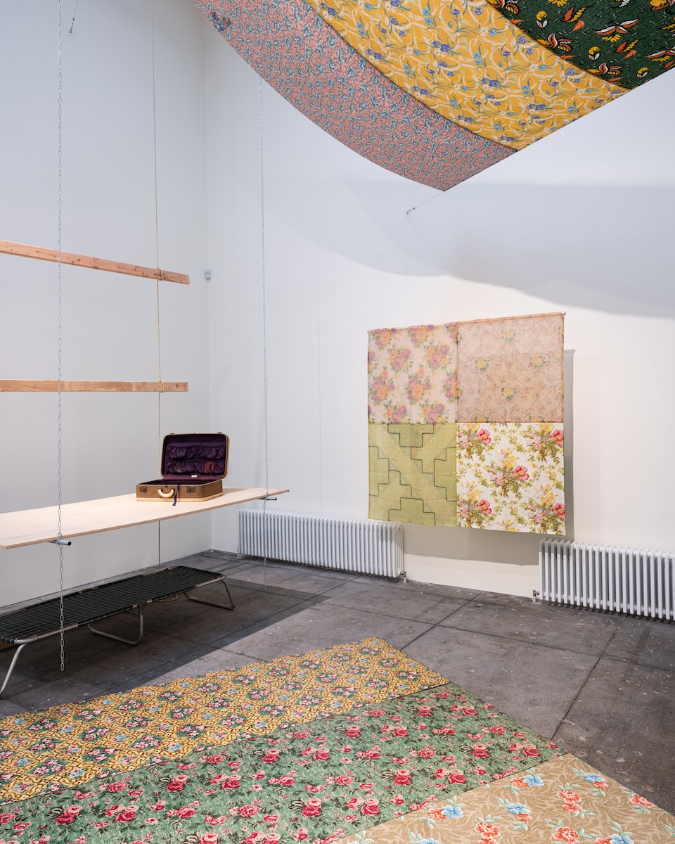 When Tina Girouard: SIGN-IN debuted at the Ogden Museum of Southern Art, New Orleans, in the spring of 2024, Hung House (1971) was featured prominently, creating a home within a gallery space. The installation, which Girouard created at her Chatham Square apartment using items left by guests who had been there for parties and rehearsals, is a makeshift two-story home precariously assembled using two-by-fours, wooden planks, rope, chains, and pieces of fabric. In the gallery, a wooden platform suspended from the ceiling held an open suitcase, a rod for hanging clothes, and a cot inviting temporary refuge. Girouard allowed visitors to interact with the installation however they liked.