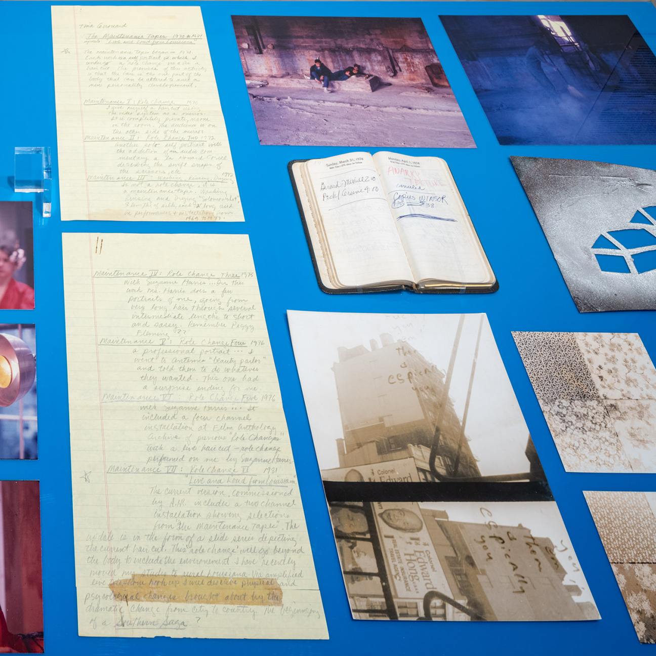 The current version, commissioned by A. I. R. includes a two channel installation showing selections from “The Maintenance Tapes.” The update is in the form of a slide series depicting the current haircut. This ‘role change’ will go beyond the body to include the environment. I have recently moved my studio to rural Louisiana. Via amplified live telephone hook up I will describe physical and psychological changes brought about by the dramatic change from city to country. The beginning of a Southern Saga?