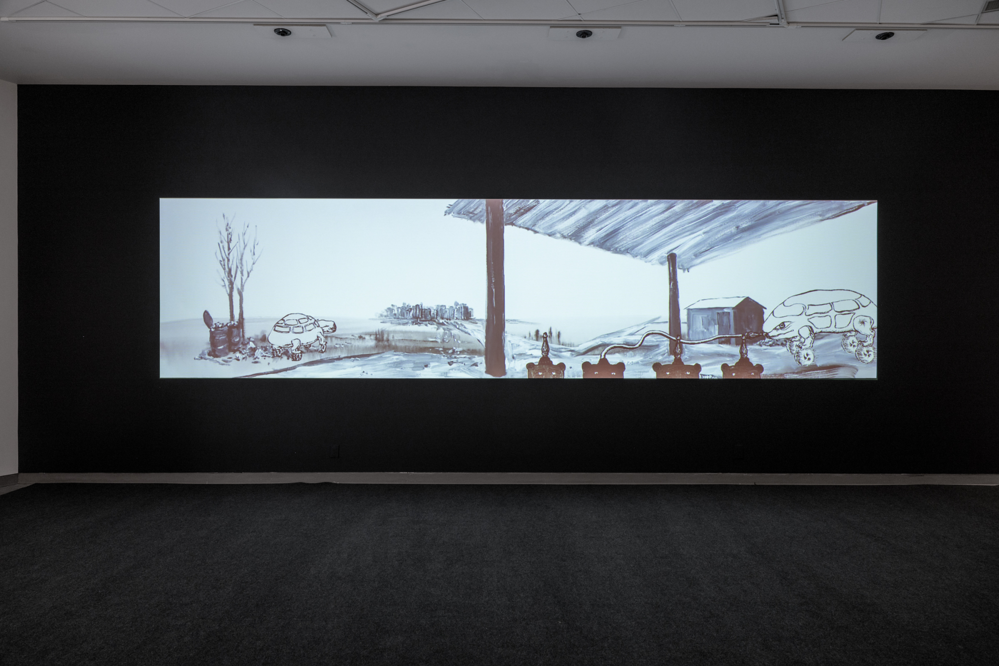 At the center of the gallery, Shanghai-based Qiu Anxiong’s ink-animation trilogy The New Book of Mountains and Seas Part 1–3 (2006–17) was projected against an entire wall. Qiu has spent the last two decades reinterpreting Chinese ink painting, using Chinese mythology and science fiction as the foundation for his artistic universe and fluidly connecting the two genres. As he puts it, “Science fiction is [the] mythology of nowadays.” So although Qiu’s trilogy draws inspiration from Shan hai jing (The Classic of Mountains and Seas)—a Chinese mytho-geographical compendium dating to the fourth century CE—the world he constructs is a near-future cyberpunk dystopia.