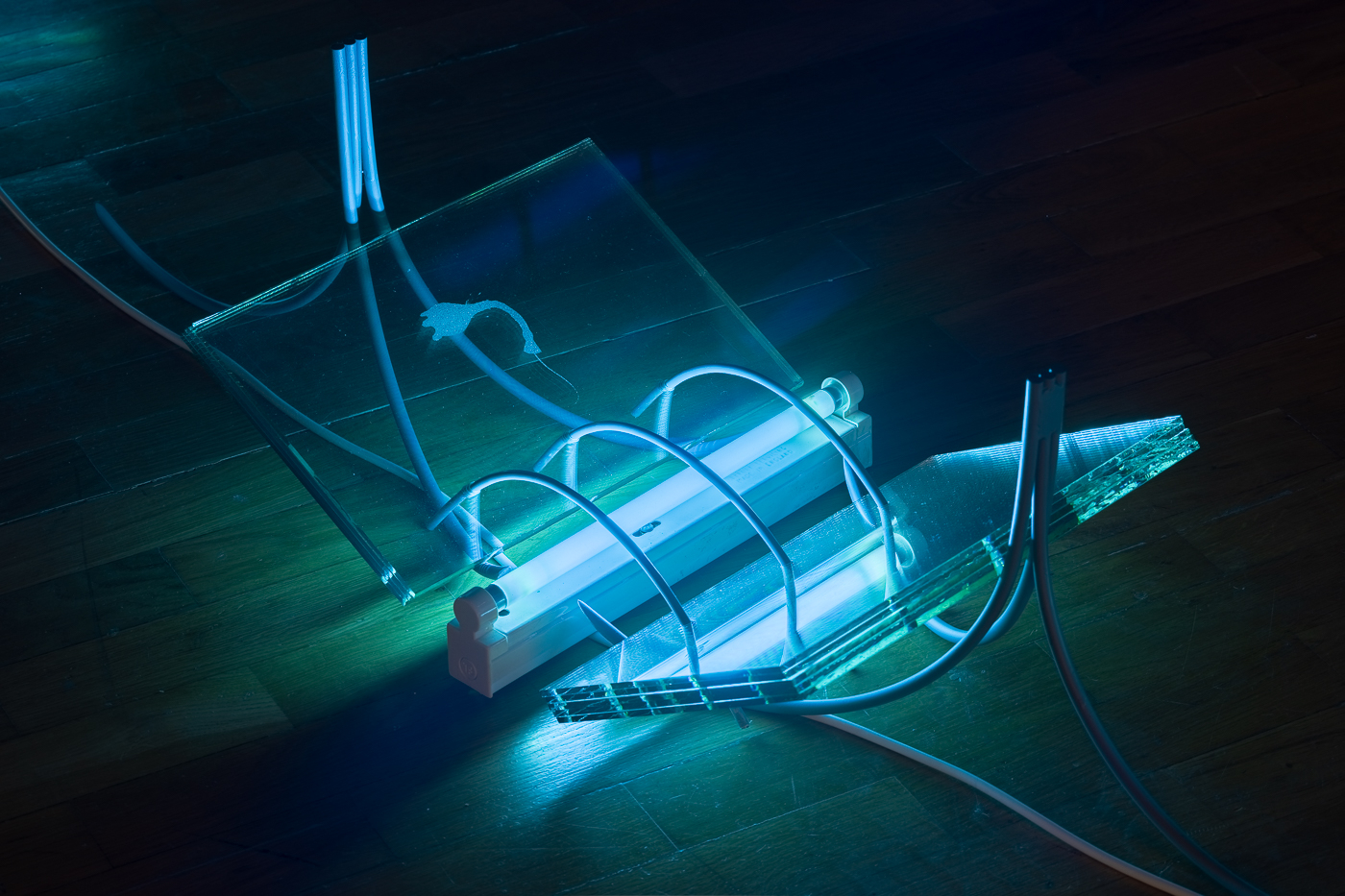 In a large room, yellow glass bulbs were suspended from the ceiling, arranged like pendulums in a Newton’s cradle, lingering precariously about a foot from the floor. Their color resulted from chlorine gas mixed with water. Nearby, a ladder stood erect against a wall with illuminated glass rungs glowing sporadically, red and iridescent. The red rungs were created by infrared lamps and heaters that continuously turned crystal iodine from solid to gas and back again. Elsewhere, a trio of pointed glass-and-steel needlelike objects arched toward one another. Each object contained bromine, which is reddish-brown when in liquid form. Chlorine, iodine, and bromine are all halogens that are highly reactive and lethal in large quantities, and are known for their use in purification and as antiseptics.