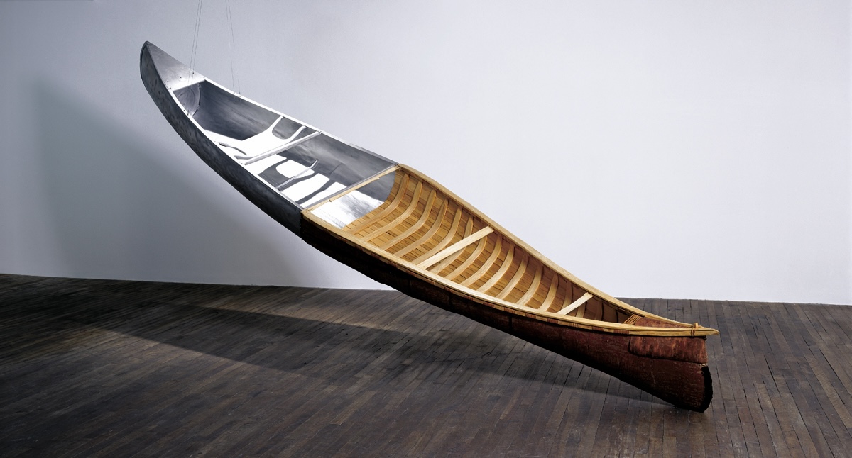 Nadia Myre: Waves of Want, curated by Rachelle Dickenson, expanded from this meditative center. The second gallery presented works that embody change in both form and feeling. History in Two Parts (2000)—a canoe constructed of birch bark, aluminum, cedar, ash, spruce, root, and gum—anchored the room. The work stages a dialogue between Indigenous technologies of travel and colonial impositions of industry, juxtaposing natural materials with manufactured aluminum. It makes visible one of the tensions Myre continually grapples with: survival and continuity of Indigenous lifeways in the face of colonial dispossession. Nearby, a series of rawhide sculptures trimmed with faux leather seemed to hold their breath. I wanted to touch them, to test their rigidity and discover how much pressure might be required to shift their form. How much can something carry before its shape must shift, adapt, or transform?