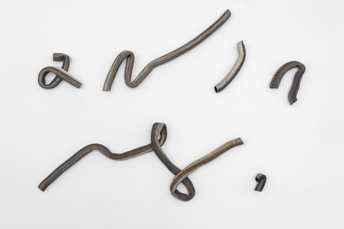 The exhibition concluded with Your Waves of Want Wash Over Us (2024), an installation of ceramic tubes arranged across a back wall. The tubes spell out “all we want is your trinket for women land oil water,” in Gregg shorthand—a phonetic writing system that privileges the sound of speech over conventional English spelling—emphasizing sensation over fixity. The phrase floated across a white wall, inviting us to spend time with the feeling of these words. While Myre’s use of shorthand gestured toward ways of knowing that exceed colonial containment, the kind of want referenced by the work’s title seemed both personal and systemic, and potentially dangerous. The use of your versus us evoked the waves of desire that propelled conquest and dispossession. Such desire shapes bodies, languages, and lands.