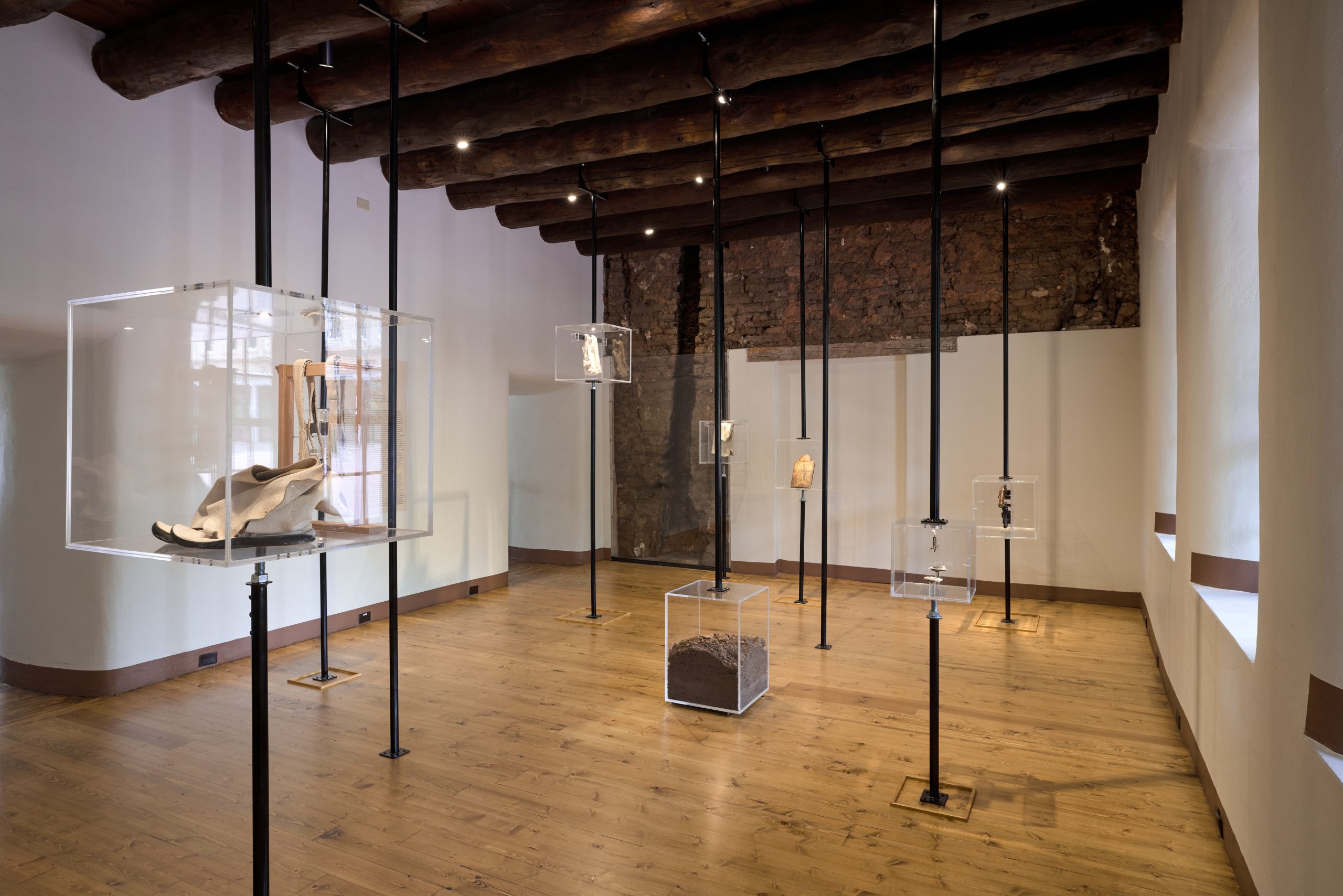 Several projects respond directly to their location, such as Daisy Quezada Ureña’s installation at the New Mexico History Museum’s Palace of the Governors, a 1610 building originally erected by the Spanish for colonial administration. The building itself is a simple one-story adobe structure with open wood beams and a central hallway that connects the gallery rooms, which are former offices and living quarters for governors spanning the centuries—Spanish Colonial, Mexican, Territorial, and the United States. In one of these rooms, Quezada Ureña displays transparent Plexiglas boxes of artifacts from the museum’s collection that speak to the colonial legacies of violence and exploitation at this specific place and within the region—such as a selection of firearms from its extensive trove of weaponry. These boxes are suspended by shoring posts used to stabilize buildings when their foundations are not secure, revealing the impermanence of colonial regimes that can—and do—fall. Quezada Ureña’s porcelain sculptures are interspersed throughout the room alongside the museum’s holdings. They are made by dipping fabric garments in porcelain slip and firing them at high temperatures so that only traces of stitching and folds remain on the surface of the clay. For the porcelain pieces, Quezada Ureña used clothing collected from people she met at the US-Mexico border, tracing their stories into these delicate works, freezing the sedimentary layers of migration, place, and history in time and inviting the viewer to contemplate their intricacies. Placed at the heart of the Palace of the Governors—also a major tourist destination—this project embraces many voices and narratives, which not only deflates the power of this museum’s colonialist past but also makes its grand narratives appear obsolete.