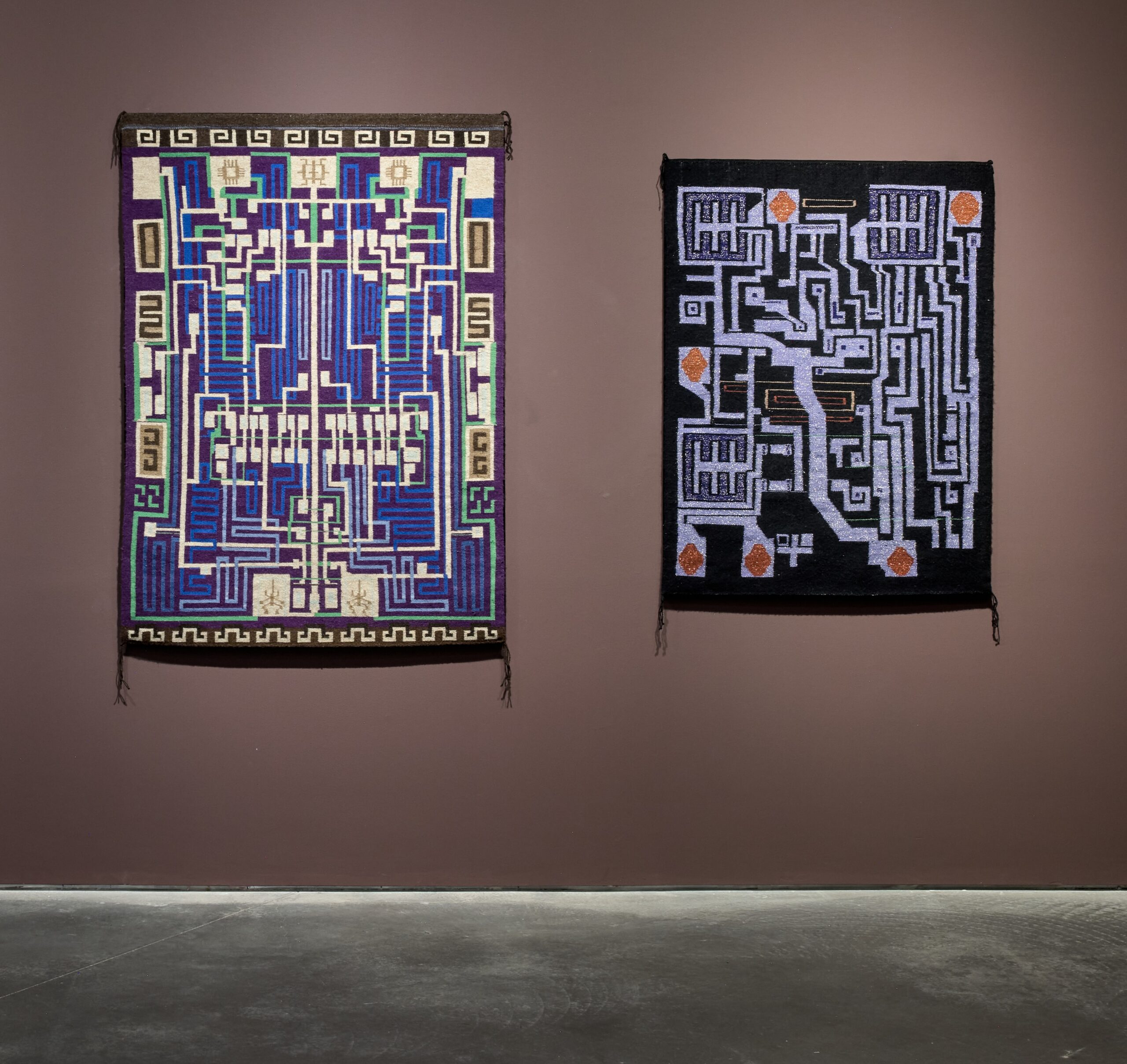The show is never overwhelming or disorienting, with informational rabbit holes that echo the surprise pleasures of scrolling. Visitors encounter a kaleidoscope of entry points, each framed by a figure of interest. Located in the SITE Santa Fe building, the section “A Good Line Is Hard to Beat” tells the story of Chester Nez, a Navajo code talker who was part of the “Original 29” who used Diné bizaad as a secret code on the battlefield in World War II. The experiences of Nez and other Navajo code talkers are relayed by a presentation of the original alphabet-code documents from these operations. Alongside this material, visitors view artworks that similarly investigate the role of code or encryption within linguistic systems. As discussed in the catalogue, New Mexico’s social and cultural history has long fostered a multiplicity of languages and, consequently, practices of translation. The story of the Navajo code talkers is just one example of the central importance of language and translation in understanding the state’s unique context. On display next to the alphabet code is Marilou Schultz’s large weaving, Integrated Circuit Chip & AI Diné Weaving (2024). A fourth generation Diné weaver, Schultz depicts a computer chip produced by Fairchild Semiconductor, which from 1965 to 1975 ran a plant on the Navajo Nation in Shiprock, New Mexico, that predominantly hired Diné women. During the economic downturn of the early 1970s, mass layoffs resulted in organizing and an eventual occupation of the factory by members of the American Indian Movement. At the top of the weaving, Schultz includes arachnid-like forms that reference the Na’ashjé’ii Asdzáá, or Spider Woman, a figure from Diné mythology who confers spinning, weaving, and storytelling. The work—and the link made to Chester Nez—conveys the longer interconnected history between computing, weaving traditions, and the female workforce.