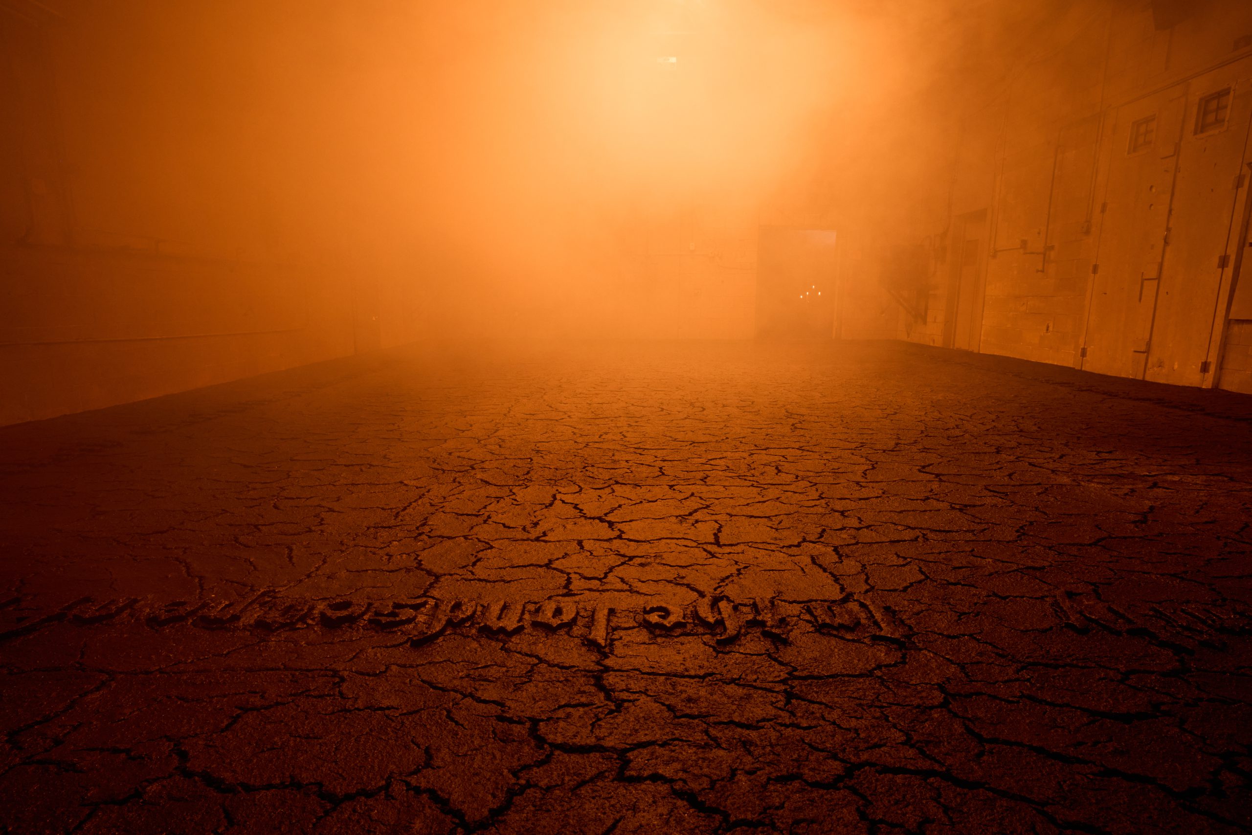 Among the highlights of the show are Korakrit Arunanondchai’s new commissions, Nostalgia for Unity (2024) and Unity for Nostalgia (2024), which carry a message of hope and rebirth that further counters hegemonic narratives. Installed in Finquita, the artist’s environment delves into the mythology of the Zozobra, or “Old Man Gloom,” an effigy burned annually as part of an arts festival in Santa Fe. Initially created as a homespun tourist attraction in 1924 by the artist Will Shuster, Zozobra has come to symbolize the ritualized burning away of sorrow. An antithesis to Zozobra, the “Fire Spirit” was introduced in 1939 as a character who embodies hope and renewal. This marionette dances around the Zozobra and eventually ignites him, symbolizing the triumph of light over darkness. The torch used in this ceremony is presented at the entrance of Arunanondchai’s installation—the only item on display. Walking onto a floor made from ash from the Zozobra’s ritual burning mixed with soil, housepaint, and medium-density fiberboard, I was initially struck by the earthy and charred scent of this material. The cracked, muddy surface was inscribed with a prayer to the phoenix written by the artist. A throbbing light and sound score that booms throughout the space makes the installation feel mystical. In the second room, the film Unity for Nostalgia is projected onto an opaque screen placed before a ring of large, lit candles. Arunanondchai’s profound response to this long-standing community event dismisses notions of “the West” as a place for individual self-realization, showing how charged and alive collective reimagination has always been and continues to be.