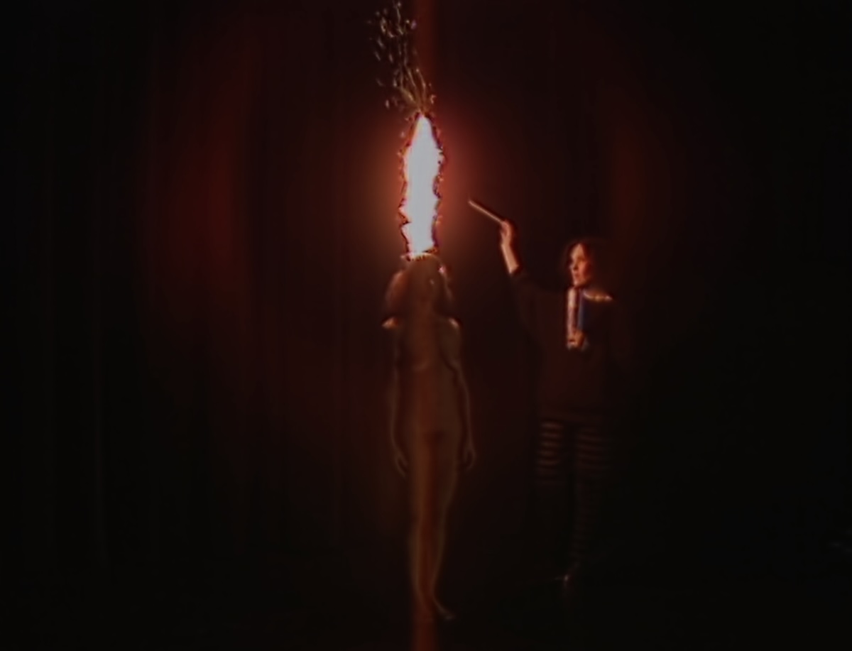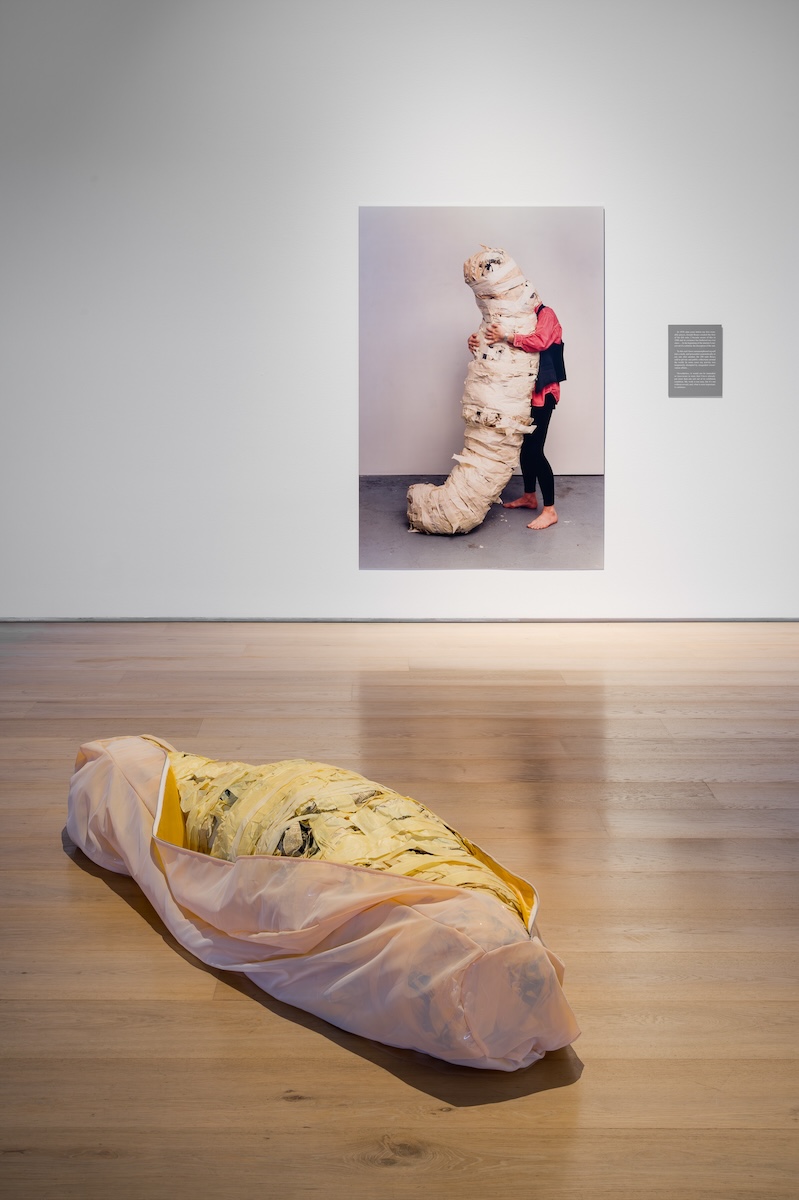 The feeling was only accentuated by the pieces in its orbit, including Absorption (a work in progress) (1995), a body-size canvas bag lying prone on the floor, unzipped to reveal a figure wrapped in paper. The work represents the entrails of Sterbak’s effort to metamorphose into a moth in order to devour each of the one hundred editions of Joseph Beuys’s iconic felt suits. It’s reinforcing a strength in her sculptural practice of setting the performance—or the imagined act—ablaze in the viewer’s mind. In Artist as Combustible (1987), a nearby video featuring a naked young woman being lit like a human candle (the artist herself makes the ignition), the flame in her hair flares and dies quickly, on a loop, leaving us trying to catch its lingering nimbus, its ambient glow.