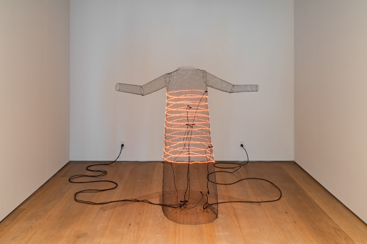 This clean survey did some heavy lifting, including a spare and blazing presentation of I Want You to Feel the Way I Do . . . (The Dress) (1984–85), a hollowed-out (rather than inside-out) dress wound with live heating wires that flare red-hot as viewers approach. [Describing a similar work, the literally hot Corona Laurea (noli me tangere) (1983–84), Diana Nemiroff—who curated Sterbak’s landmark 1991 exhibition at the National Gallery of Canada—termed it “a diabolical machine.”] Then there was Seduction Couch (1986–87), made of perforated steel and a floodlamp that exemplifies the perils of intimacy: the bed crackles with light when you approach it, an object made more dangerous by its affiliations with analysis and sex. These two works resist easy capture; the threat of flammability and shock appears only when viewers get close, forcing us to retreat.