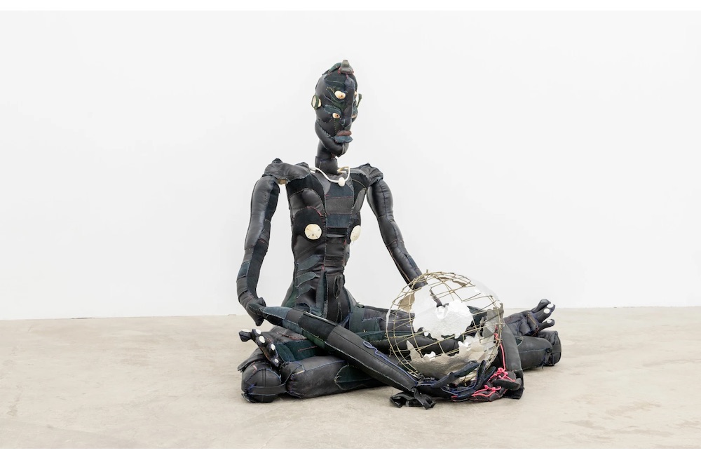 Over the course of a studio visit with Lewis on a hot September day, I observe her sit almost intimately near a sculpture central to her upcoming presentation in Art Basel Miami Beach (with Toronto gallery Cooper Cole). Harmony (2019) is long-limbed, spindly, and roughly sewn together – a spidery black figure in a posture of meditation, holding a threadbare, emptied-out globe. Her toenails are made of seashells that look like pale moons, as are her breasts. Her face carries several sets of eyes, and the darning of her black body suggests empathy and intensity, her stitching worked-over and hard-won. Harmony looks as if it has lived a very storied life.