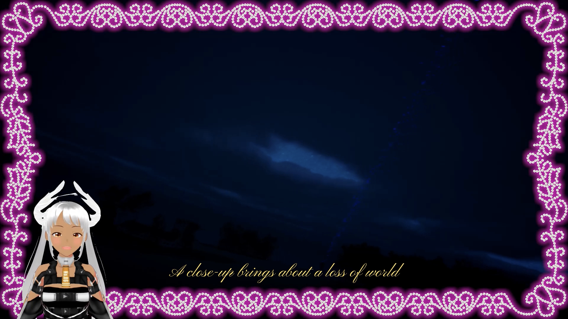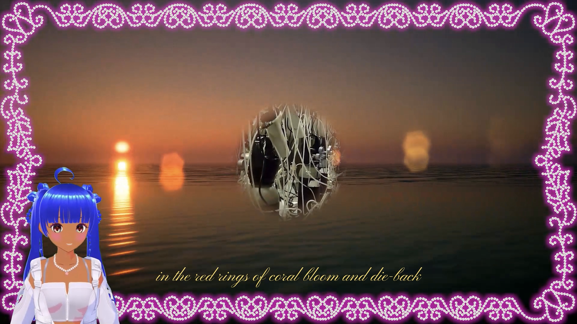 Three “V-tubers,” acting as avatars for nonhuman actors—a coral polyp, a carabao calf, and a nanosatellite—lead viewers on tour. Their observations repeatedly reveal their nonhuman forms of perception, shaped, in the case of the satellite, by their existence in swarms where they share consciousness and operate at a distance from the earth; or, conversely, as with the polyp from the coral-swarm colony, their extreme proximity to earth, dispersed within ocean currents. For example, we watch the nanosatellite grow tender at human-based territorial anxieties that inform her very purpose: “I just think it’s cute how you smuggle all your fears and desires into something so vast and subject to change. Every island that you build is swallowed by water again,” she says. Her nonhuman, collective mind interprets her own human-designed mission—gathering information to protect nationhood—as oddly desperate, though she is touched by the human insistence on control.
