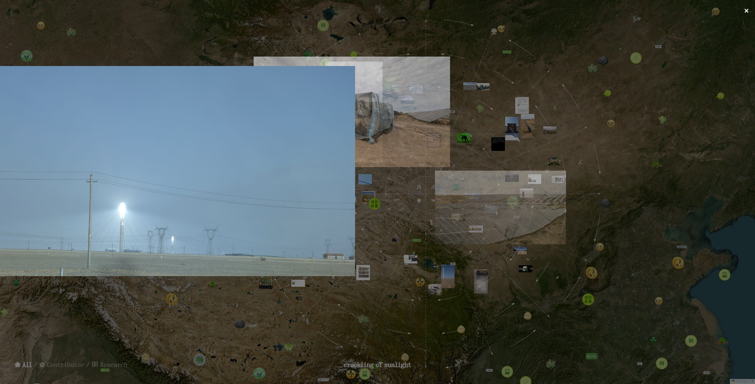 As I zoom in on Weil’s atlas, image clusters begin to resolve, and scenes of a travel journal appear: snapshots of a breakfast plate, a man peering into a car window, ancient star maps photographed through a museum glass case, screenshots from popular Chinese social-media sites. Resolutely lo-fi, these images convey a sense of intimacy. Snippets of text hover over the visuals, together forming an animated chorus revealing a lesser-known side of the Great Green Wall. I learn, for instance, how the new forest landscape gave rise to parasitic rhizomes, like the Cistanche, a plant long valued in traditional herbal medicine. As the artificial forest imposes new lifeways and displaces entire villages, organisms find growth in its interstices, forming new ecologies.